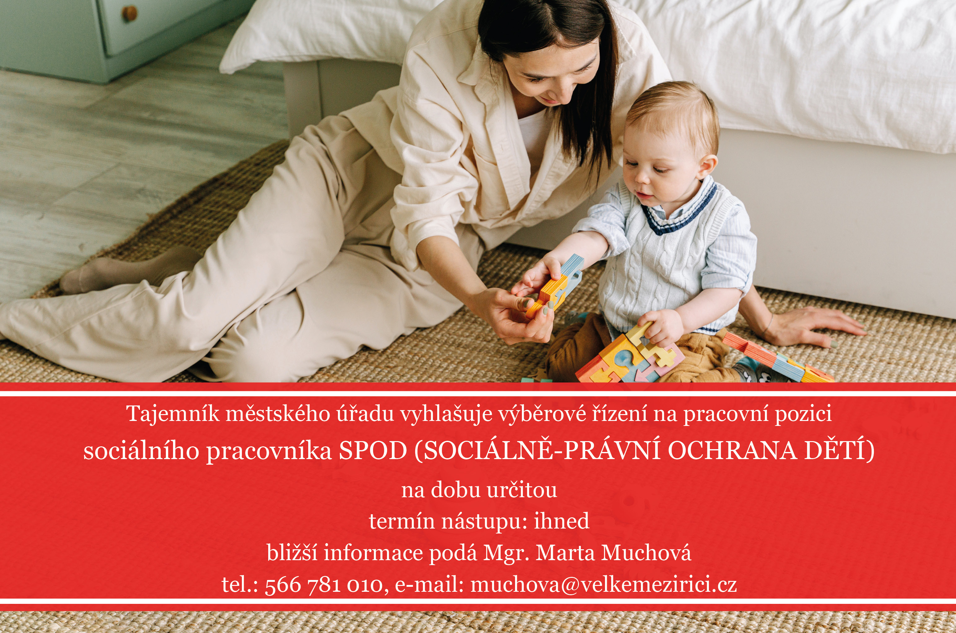 Tajemník Městského úřadu Velké Meziříčí vyhlašuje výběrové řízení na sociálního pracovníka SPOD (sociálně-právní ochrany dětí).