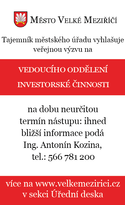 Tajemník Městského úřadu Velké Meziříčí vyhlašuje výběrové řízení na vedoucího oddělení investorské činnosti.