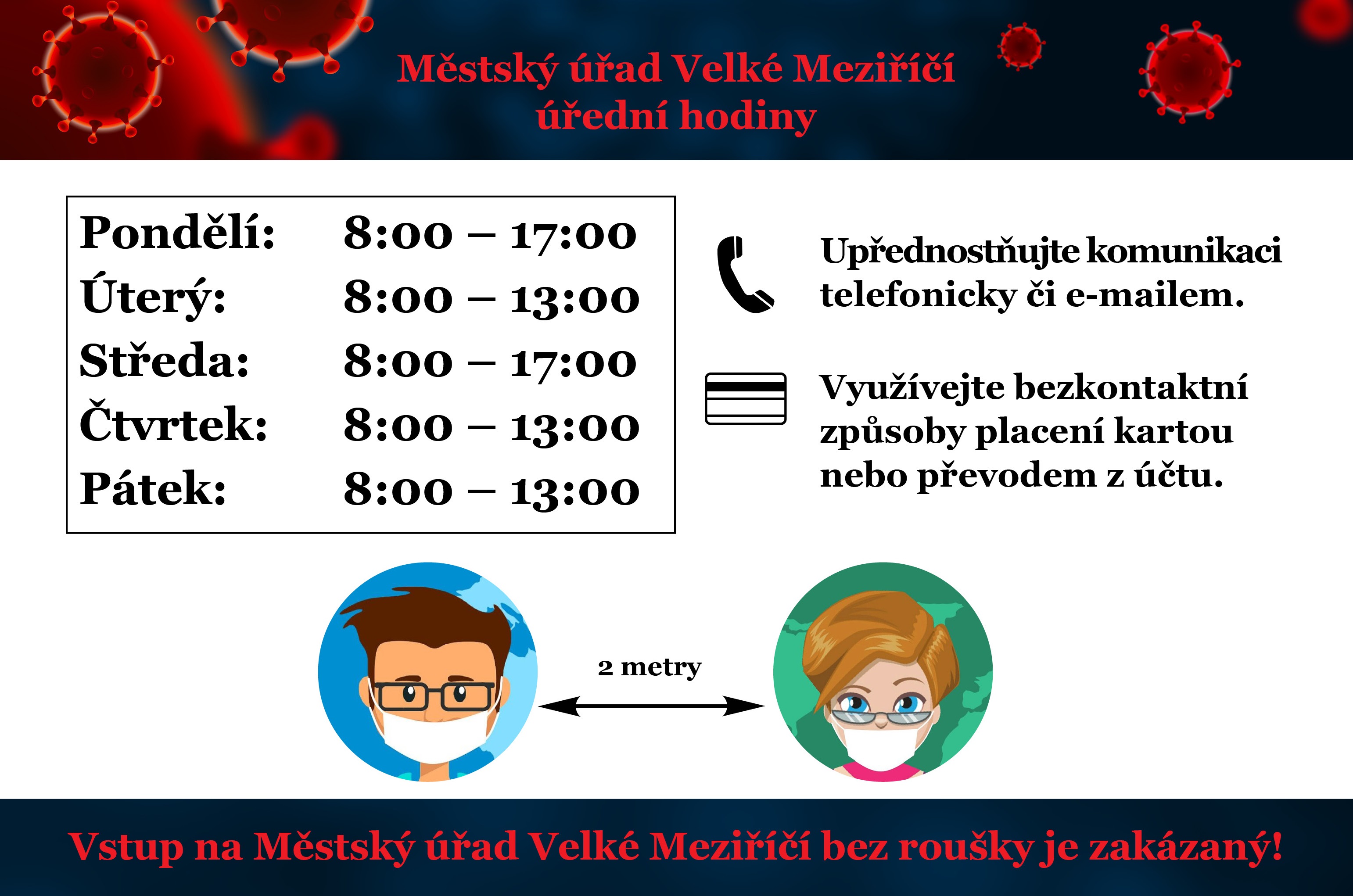 Povinnost nosit ochranné prostředky dýchacích cest, jako je respirátor, rouška, ústenka, šátek a jiné, platí ve všech budovách Městského úřadu Velké Meziříčí. Nařízení, které vydalo Ministerstvo zdravotnictví ČR, vešlo v účinnost 1. září a potrvá do odvolání. Upřednostňujte komunikaci telefonicky popřípadě e-mailem a pokud možno využívejte bezkontaktní způsoby placení kartou nebo převodem z účtu.