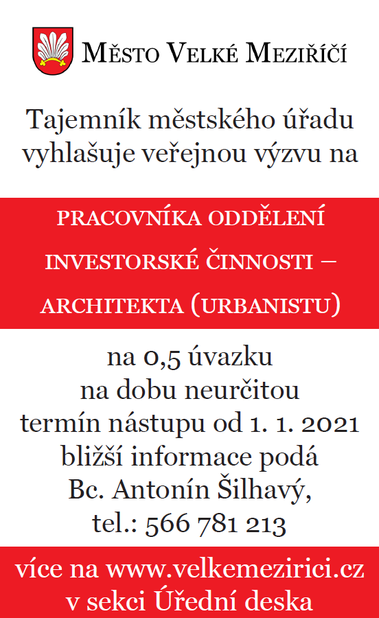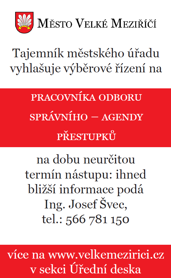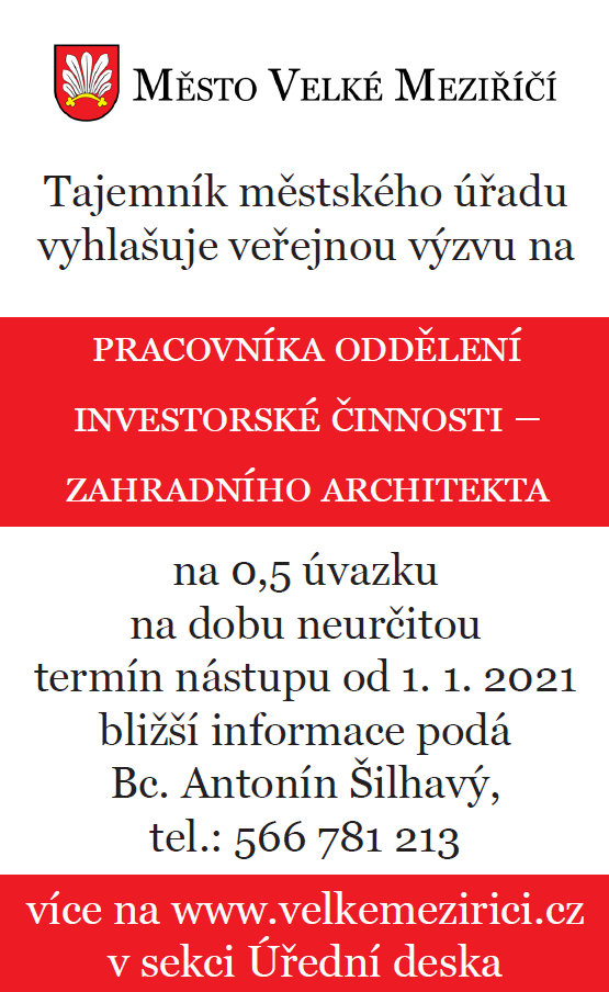 Tajemník Městského úřadu Velké Meziříčí vyhlásil veřejnou výzvu na pozici pracovníka oddělení investorského – urbanistu a také zahradního architekta. Dále přijme pracovníka odboru správního – agendy přestupků. Poslední pracovní nabídka se týká Velkomeziříčska, kam město Velké Meziříčí hledá vhodného uchazeče na pozici redaktor, grafik. Všechna výběrová řízení mají společný termín pro podání přihlášek do 26. října do 12 hodin, stejně tak jako délku trvání pracovního poměru na dobu neurčitou. Podrobné informace naleznete na úřední desce.