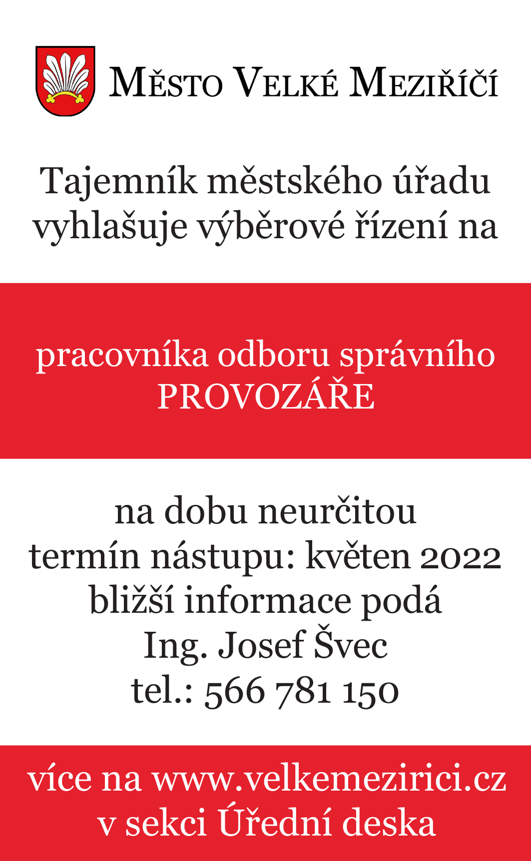 Tajemník Městského úřadu Velké Meziříčí vyhlásil veřejnou výzvu na pozici pracovníka odboru správního – provozáře, dopravního referenta.