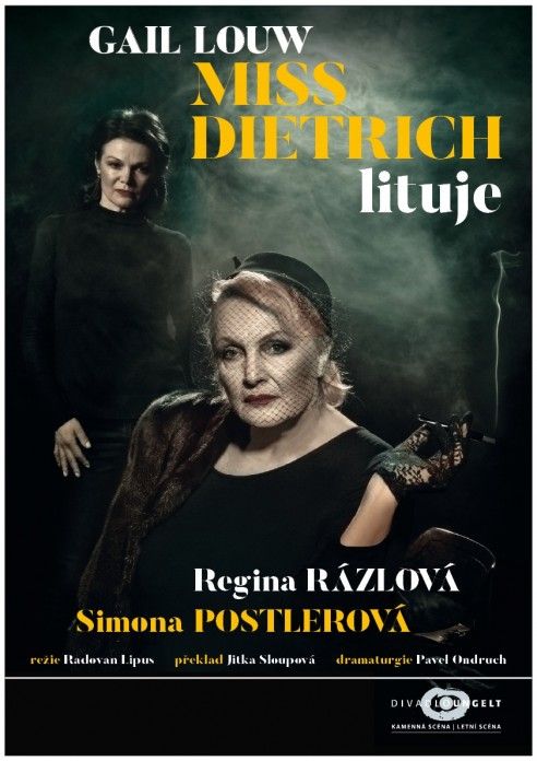 Divadlo Ungelt Praha. Matka Marlene Dietrich a její dcera Maria Riva ve strhujícím rodinném souboji. Láska a sebeláska, zlatý prach slávy a neúprosný čas, věčná bitva s minulostí. Kdo zvítězí ... ? Hrají: Regina Rázlová, Simona Postlerová. Představení je součástí divadelní sezony podzim 2019.