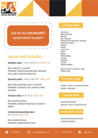 Podrobnější informace, o talentových zkouškách na jednotlivé obory, naleznete na oficiálním webu Základní umělecké školy Velké Meziříčí.