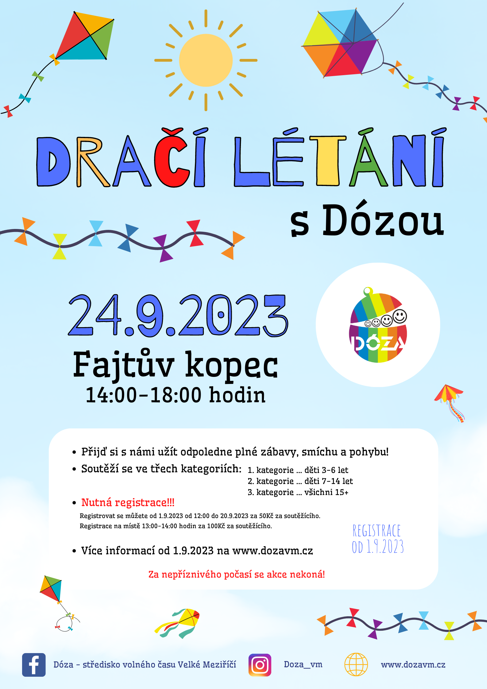 Na Dračí létání na Fajtově kopci se můžete těšit 24. září. Odpoledne plné zábavy, smíchu a pohybu proběhne od 14 do 18 hodin. Se svými papírovými výtvory můžete soutěžit ve třech kategoriích – děti 3–6 let, děti 7–14 let a všichni nad 15. Nezapomeňte, že k soutěži je nutné se registrovat, a to už od 1. do 20. září, cena je 50 Kč. Registraci lze provést i přímo na místě, ovšem za cenu 100 Kč. Za nepříznivého počasí se akce nekoná.