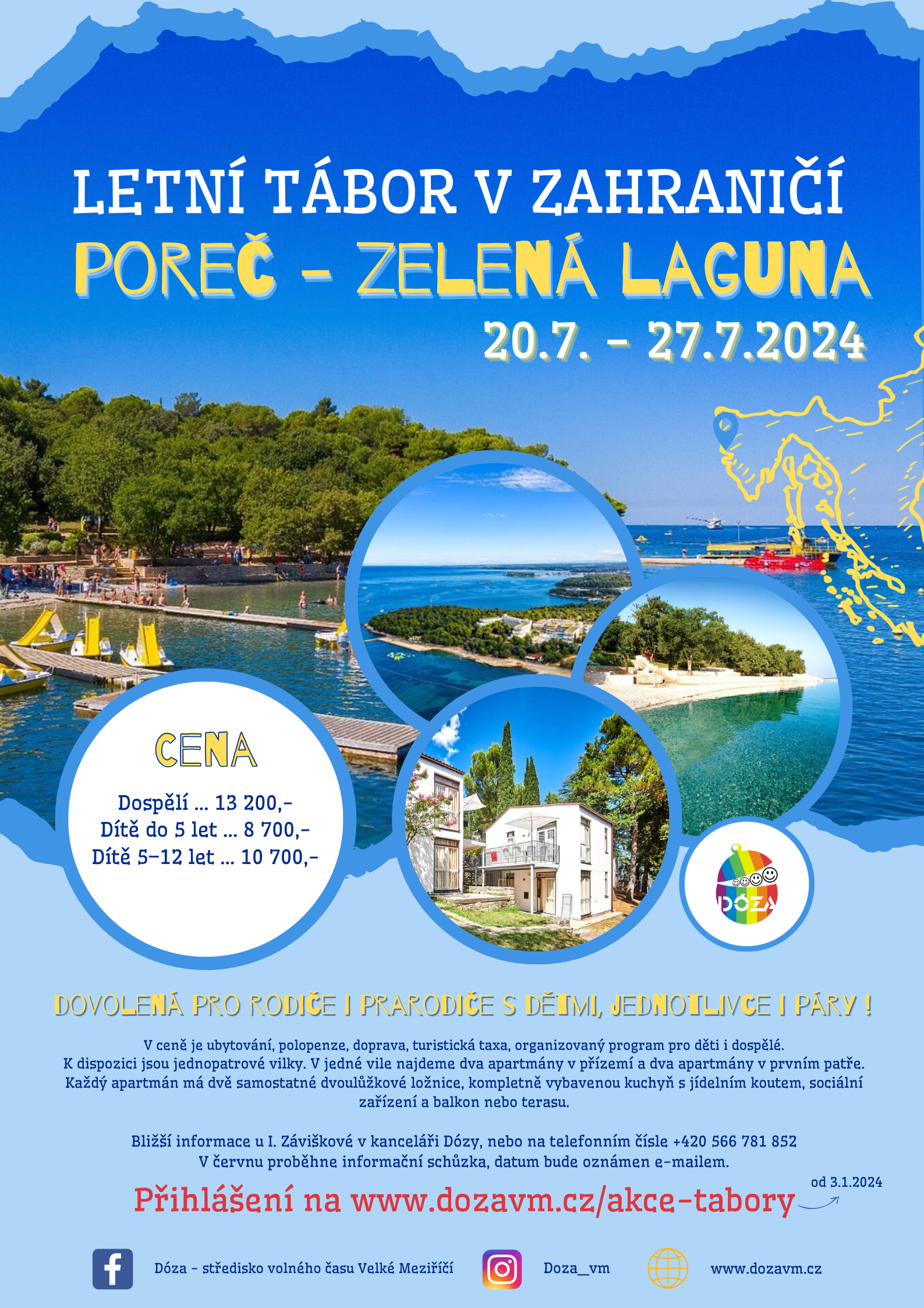 Vycestujte do chorvatského města Poreč – Zelená Laguna. Tábor je ideální pro rodiče a prarodiče s dětmi, jednotlivce nebo páry. Zkrátka pro všechny, kteří chtějí zažít nezapomenutelné dobrodružství v zahraničí.
