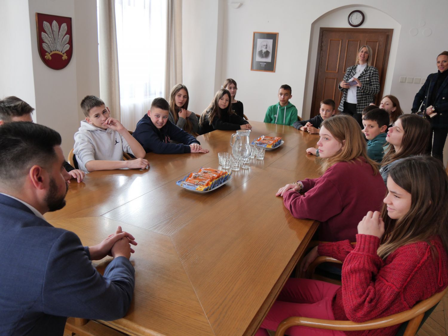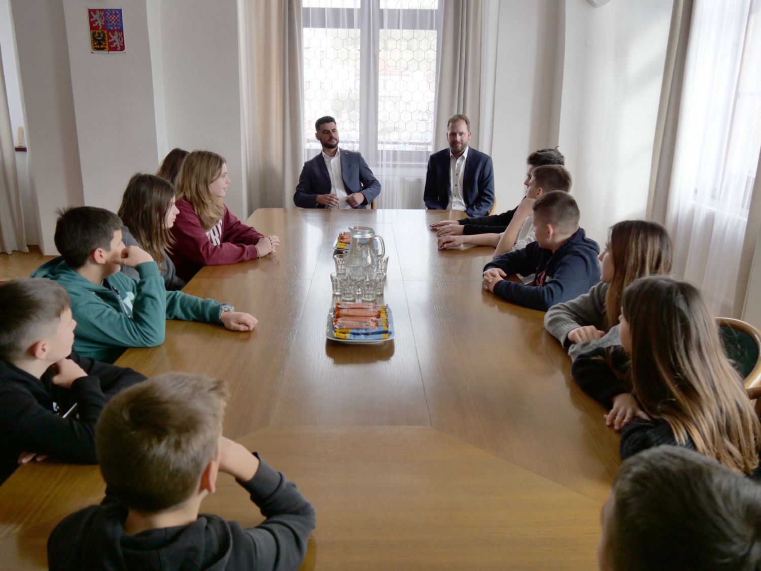 Patnáct páťáků, šesťáků a sedmáků, z toho pět nejlepších žáků základní školy v Tisnu, za doprovodu učitelek a tisenského zastupitele Karla Klarina budou až do soboty pobývat ve Velkém Meziříčí. Starosta spolu s místostarostou Martinem Kamanem je přijal ve své pracovně na radnici, kterou jim blíže představil a pověděl jim pár zajímavostí z historie budovy i města.