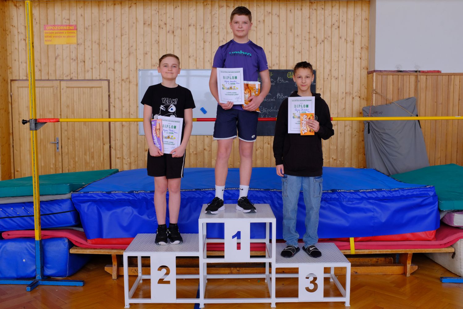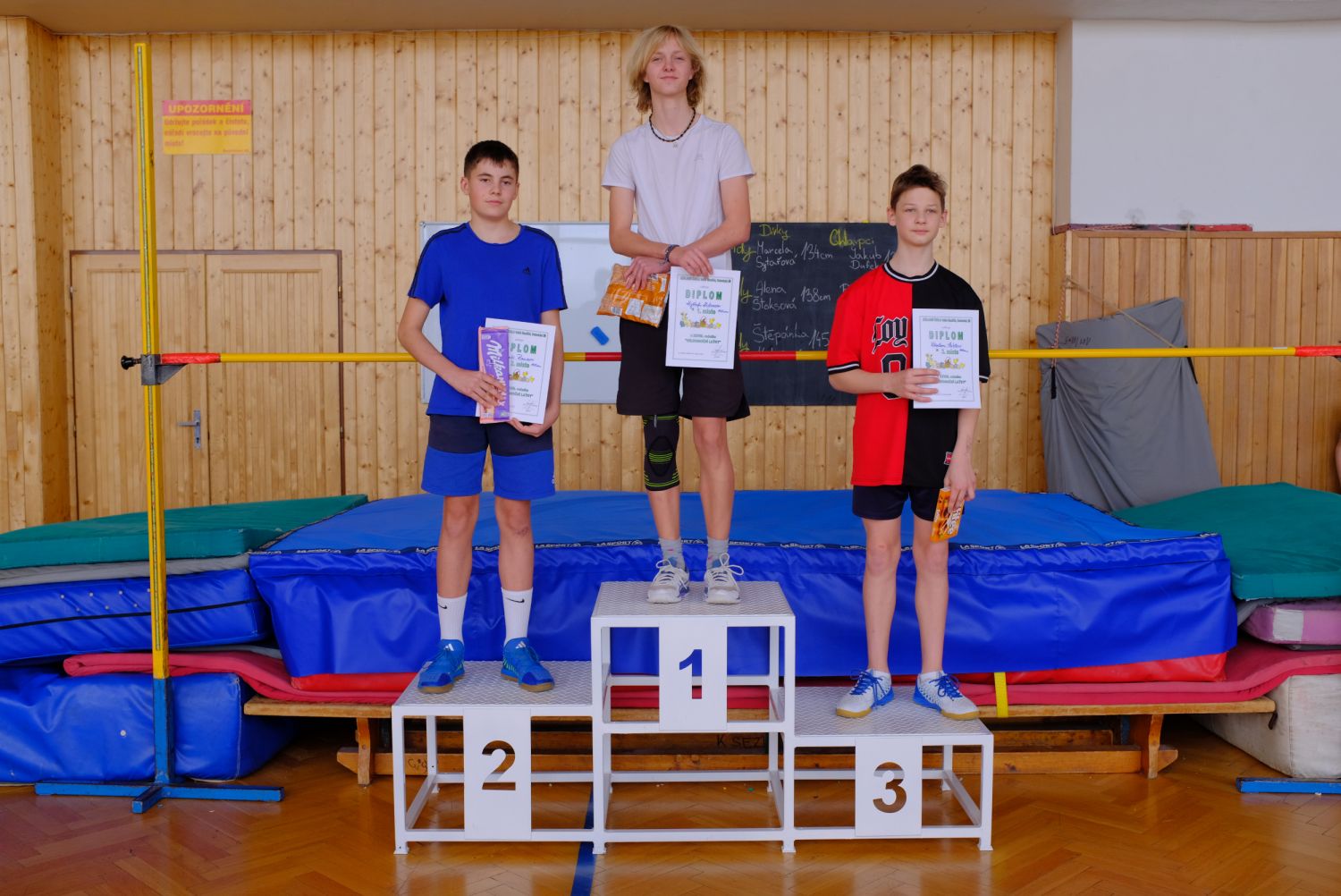 Kategorie chlapců byla daleko početnější a výrazně dramatičtější. Již mezi páťáky rozhodovaly při stejně zdolané výšce 115 cm nezdařené pokusy. Prvenství tak nakonec patří Benjaminu Peškovi před Zdeňkem Muchou. Třetí v pořadí Vít Kučera byl pak na pokusy nejlepší z pětice skokanů zdolavších 105 cm. Zamotanou situaci šestice chlapců 6. tříd na výšce 120 cm až v rozeskakování vyřešil nejlépe vítěz Jakub Janoušek, druhé místo nakonec obsadil Daniel Prášek, třetí post získal Šimon Babák. Mezi sedmáky drama pokračovalo až do výšky 145 cm, kterou zdolali pouze dva skokani. Lépe na pokusy byl Kryštof Koten, který byl v tomto ohledu úspěšnější než loňský vítěz Tomáš Raus, třetí místo získal Vítězslav Hubl 140 cm.