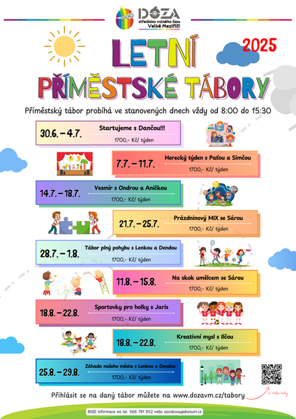 Tábory se budou konat během července a srpna a nabídnou dětem pestrý program plný her a zábavných aktivit. Připravená je řada zajímavých témat od vesmíru, sportu, umění až po rozluštění záhady našeho města. Každé dítě si tak může najít to, co ho nejvíce baví.