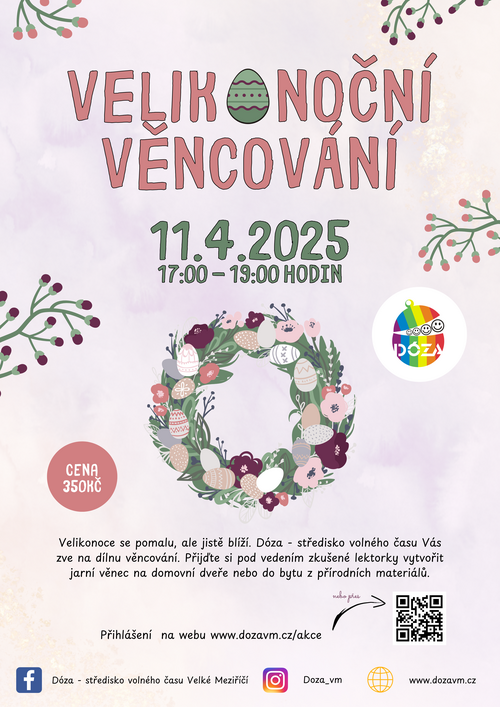 Dóza – středisko volného času srdečně zve všechny milovníky jarních dekorací na dílnu s názvem "Velikonoční věncování". Tato kreativní akce se uskuteční 11.4.2025 od 17:00 do 19:00 v prostorách Dózy.