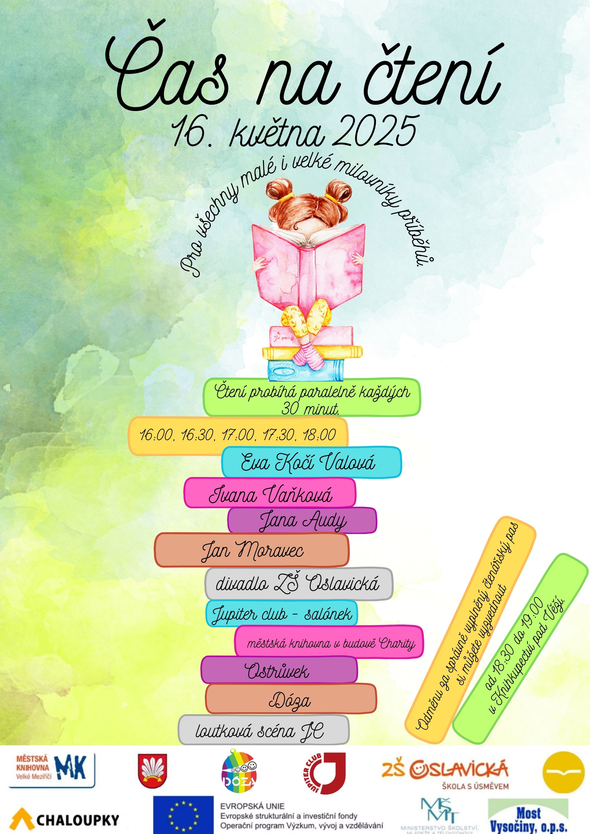 Dne 16. května od 16:00 se můžete účastnit akce Čas na čtení, která se uskuteční ve Velkém Meziříčí a nabídne zajímavé čtenářské osobnosti. Jedná se již o čtvrtý ročník akce.