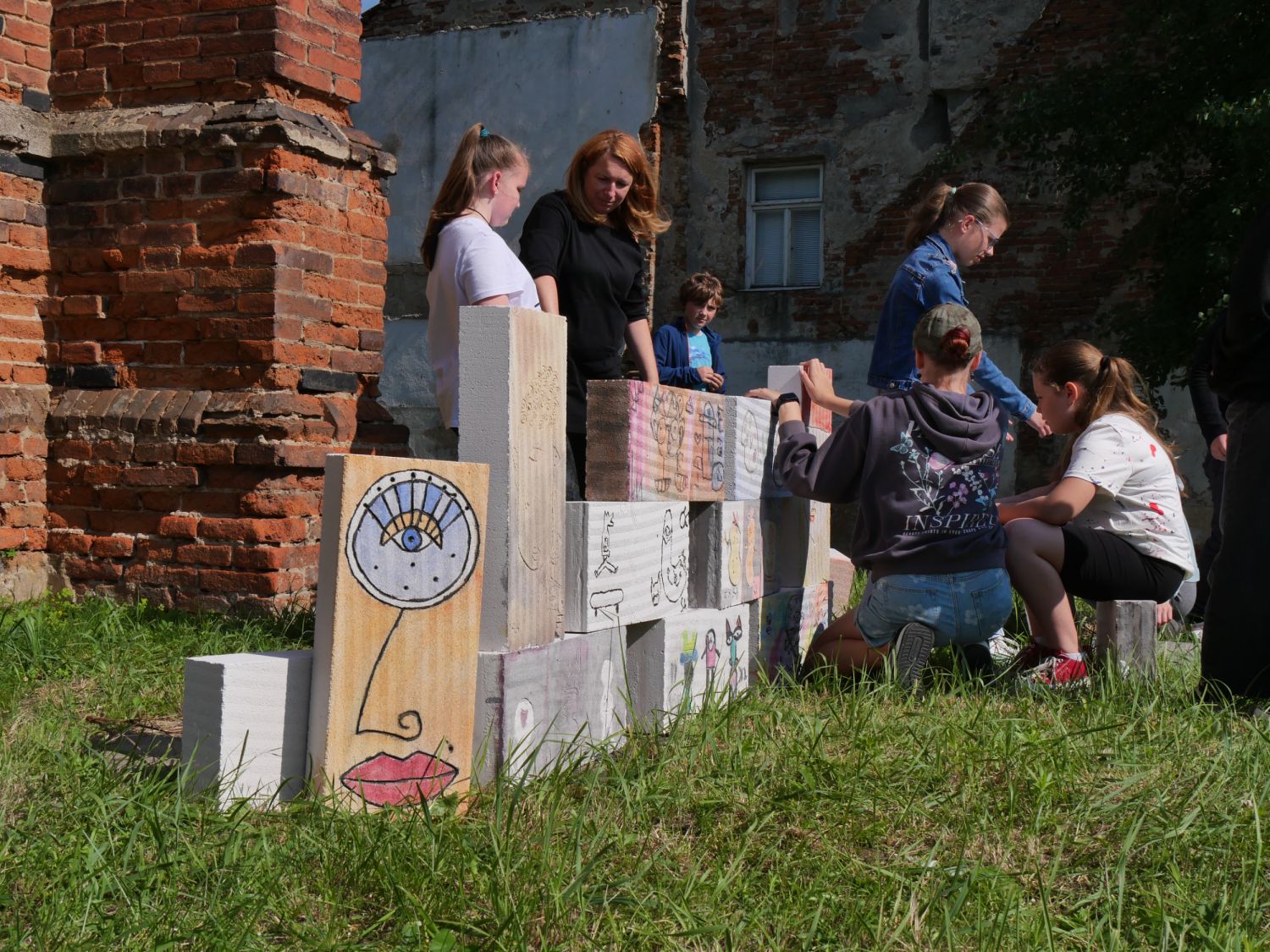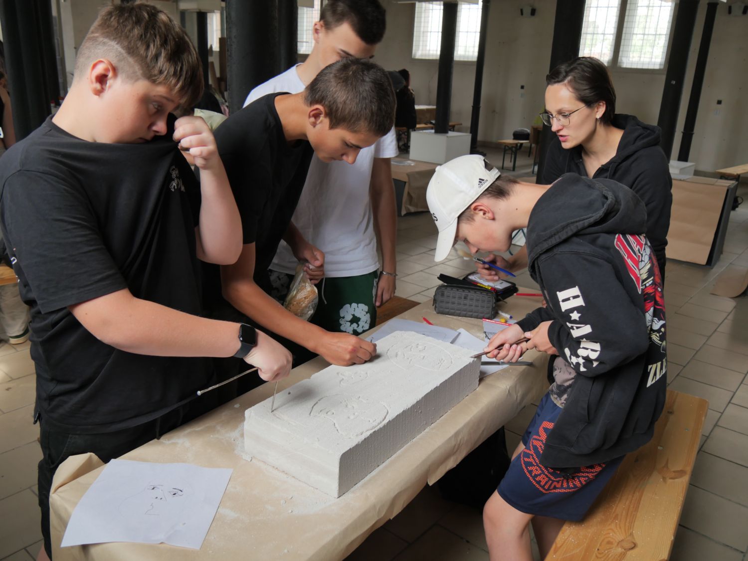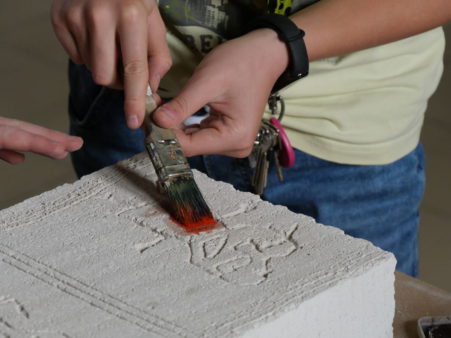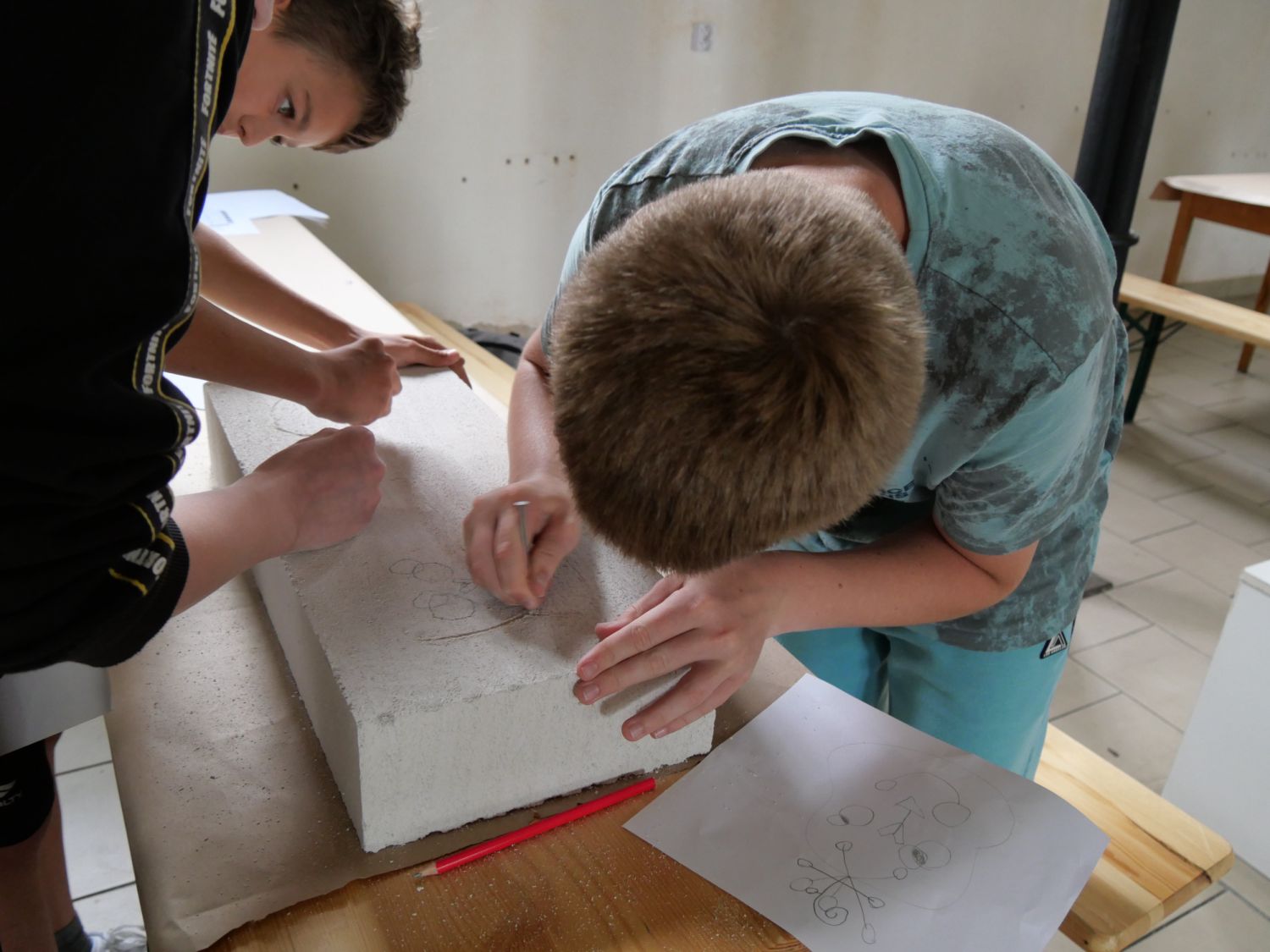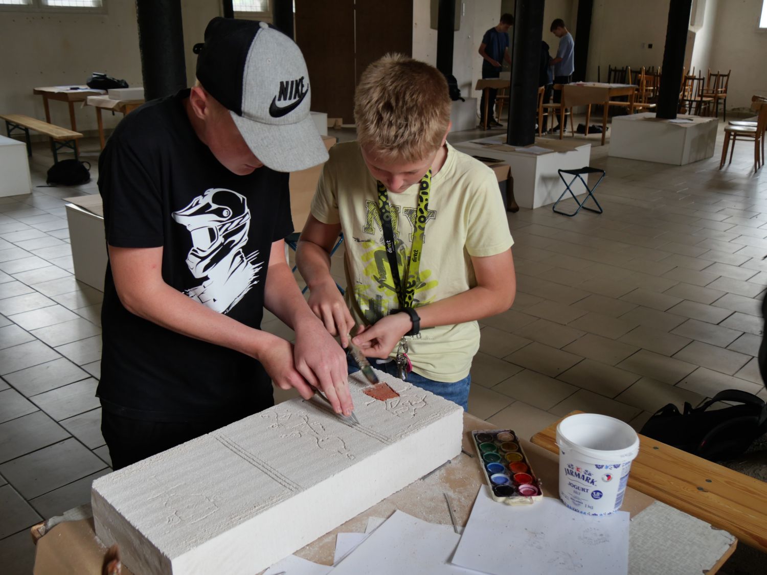 Náčrty pak přenesli na pórobetonovou cihlu a konečný obraz vyryli pomocí ostrých nástrojů. Ve finále pak svá díla barevně doplnili. Vznikla celá řada zajímavých obrazů. V synagoze děti pracovaly pod vedením Alice Trojanové, Marie Kudláčkové a Jany Štursové.