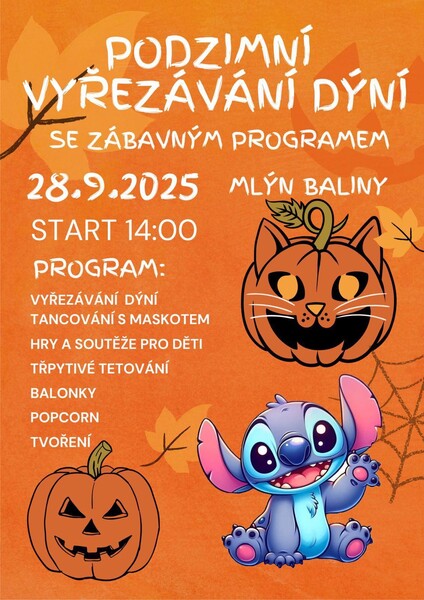 Ve dvě hodiny odpoledne v neděli 28. září startuje na mlýně v Balinách Podzimní vyřezávaní dýní, které bude spojeno se zábavným programem. Vedle vyřezávání dýní se můžete těšit na tancování s maskotem, hry a soutěže pro děti, třpytivé tetování, balónky, popcorn a hravé tvoření.
