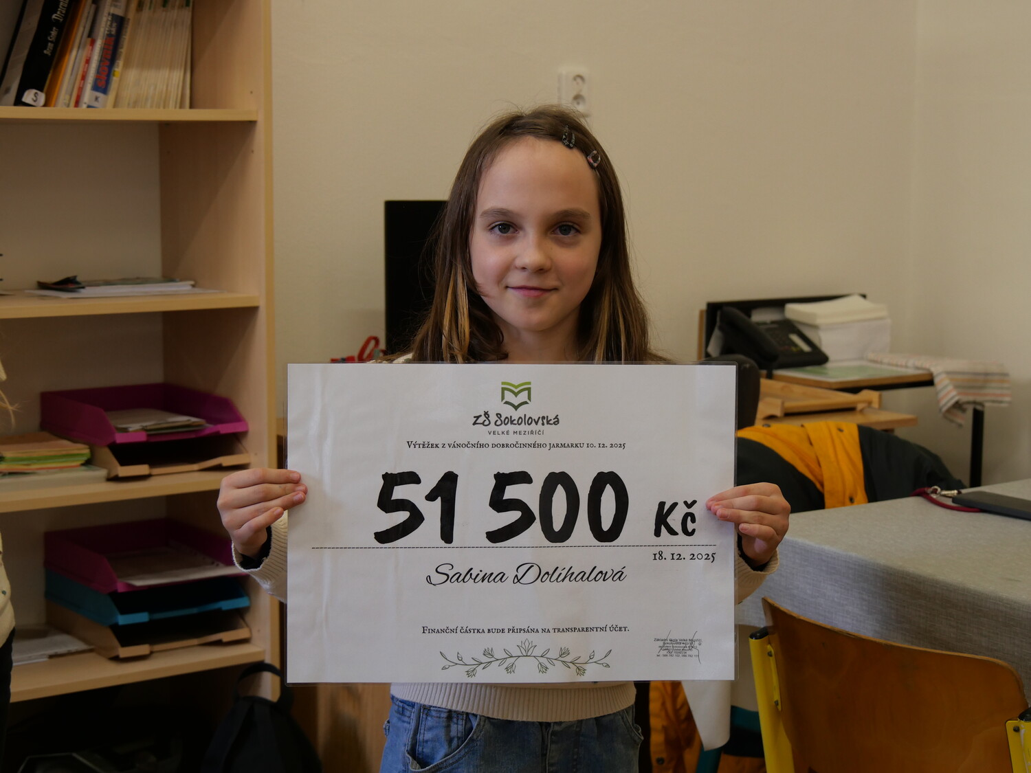 Ve čtvrtek 18. prosince krátce před polednem si Sabinka šek s touto krásnou částkou převzala.