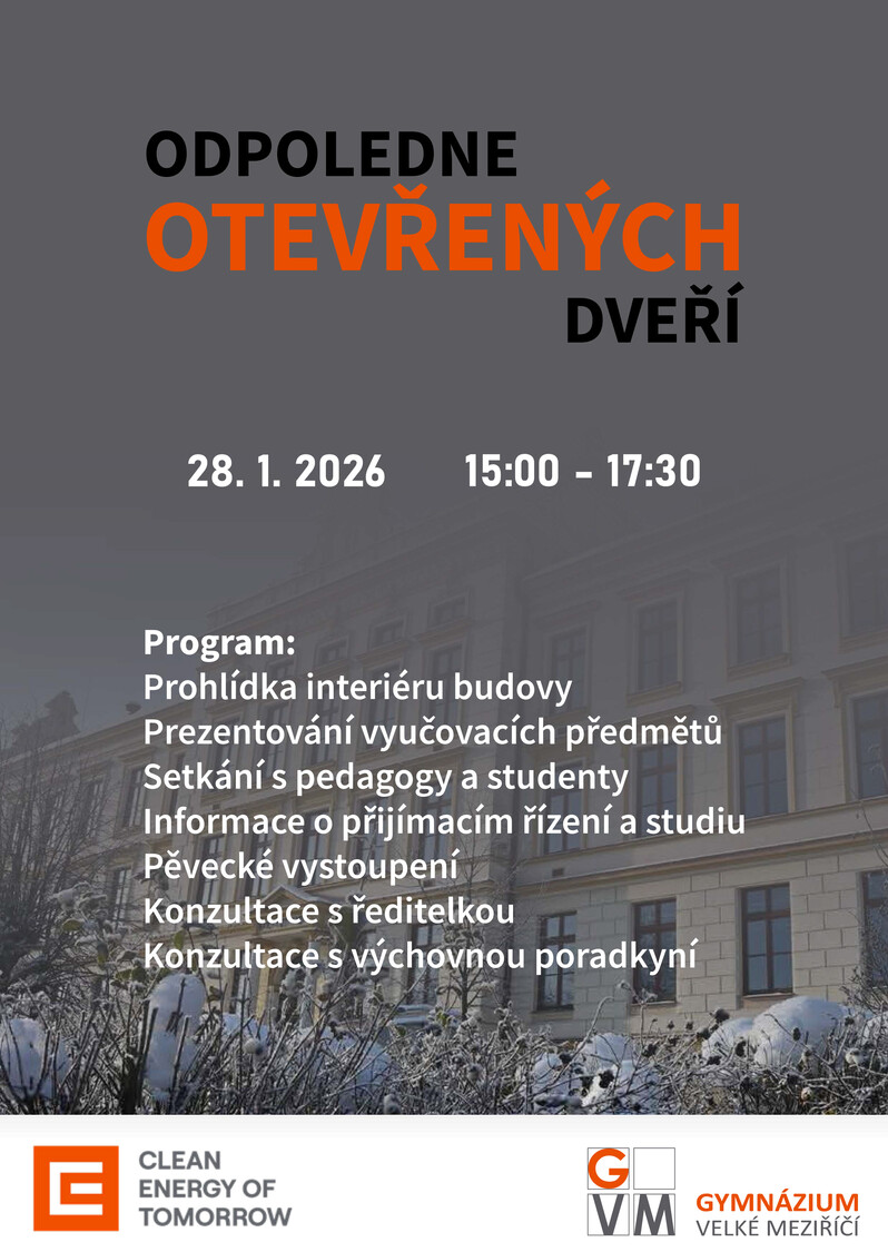 Velkomeziříčské gymnázium chystá na středu 28. ledna odpoledne otevřených dveří. Zájemcům nejen o studium otevře brány v 15 hodin a zavře v 17.30.
