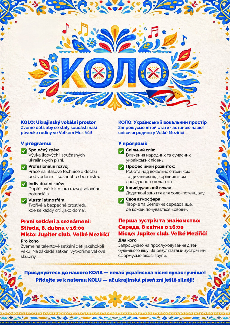 Kroužek povede zkušená lektorka paní Daria Rogová, sbormistryně a učitelka hudby. Hudební vzdělání získala na Národní pedagogické univerzitě v Kyjevě s následným potvrzením na Univerzitě Karlově. Dlouhodobě žije ve Velkém Meziříčí, plynně hovoří česky a působí jako umělecká lektorka v Centru Kociánka na Březejci.