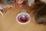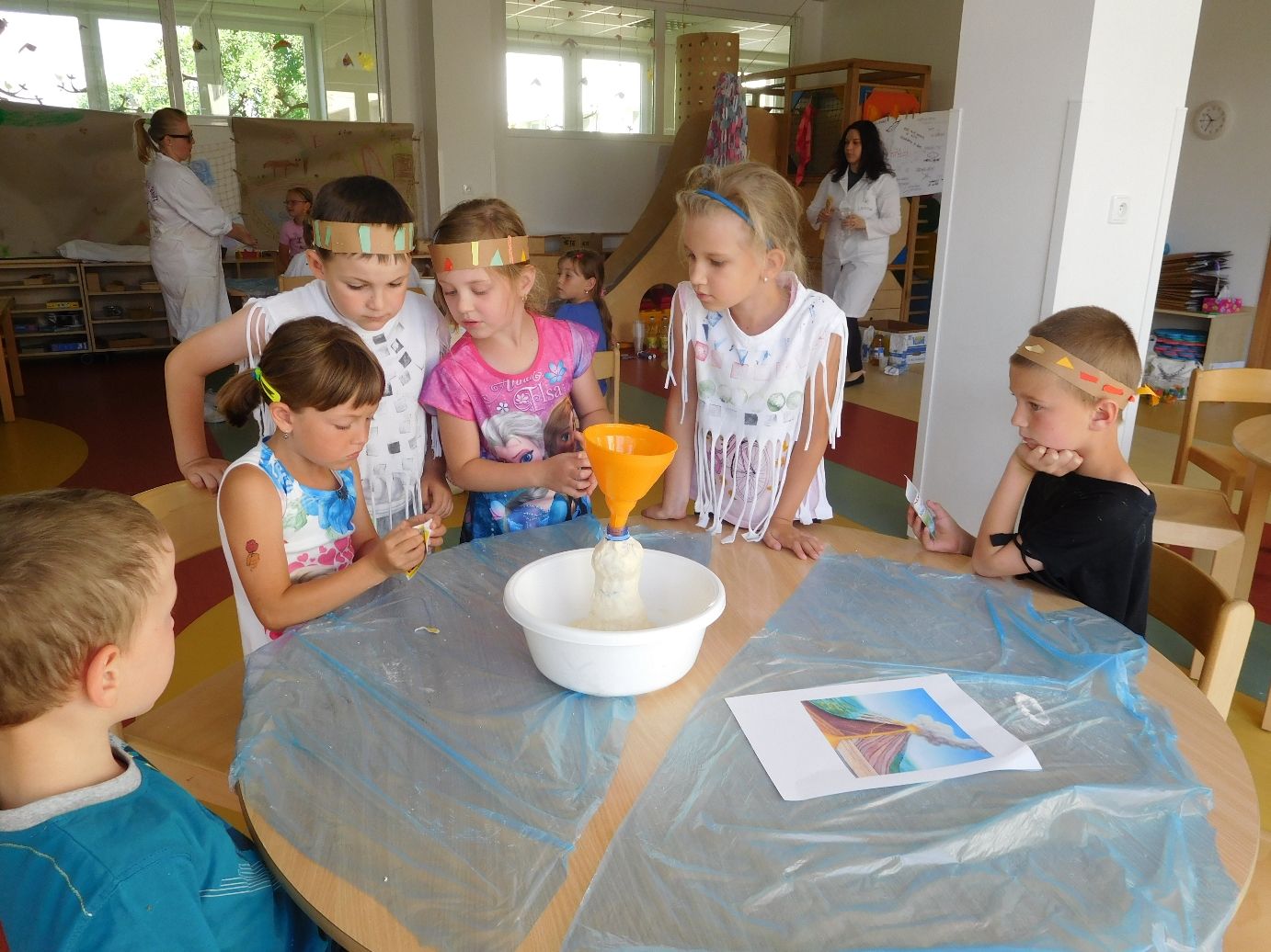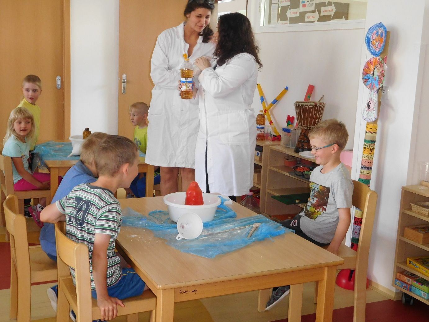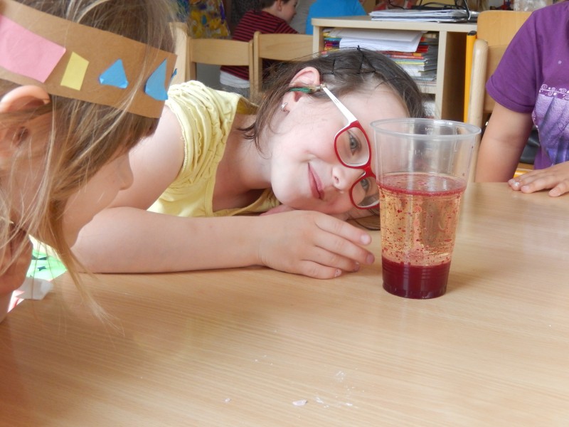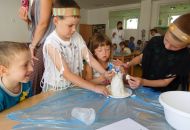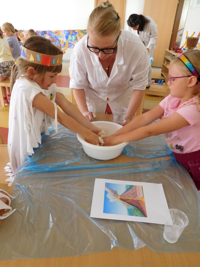 Pokusem číslo jedna byla obecně oblíbená sopka. Nejprve si lektorky s dětmi vysvětlily rozdíl mezi magmatem a lávou, popsaly si jednotlivé části sopky a s nadšeným očekáváním sopečné erupce se pustily do práce. Jednotlivé skupinky uhnětly z mouky, soli a vody těsto, kterým obalily plastovou láhev tak, aby objekt připomínal vulkán. Do láhve se pak nalila voda, která se obarvila potravinářským barvivem, a saponát na nádobí. Poté stačilo už jen přidat kypřící prášek, trochu octu a ze sopky se valila láva. Následovala výroba lávových lamp, jež byly pro některé děti neznámým pojmem. Složitou představu ovšem zrealizovaly jednoduchým postupem. V plastových kelímcích nalily k obarvené vodě olej. Obě tekutiny se vzhledem k rozdílné hustotě oddělily tak, že barevná voda zůstala dole a olej nahoře. Ke kýženému efektu lávové lampy se dospělo vhozením šumivé tablety do kelímku.
