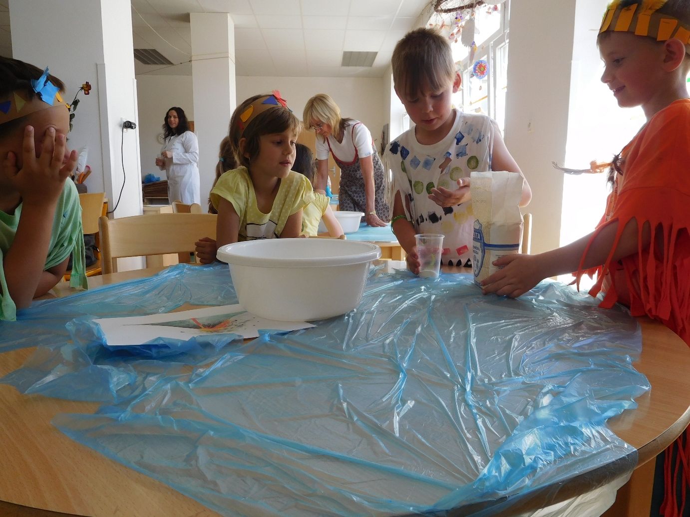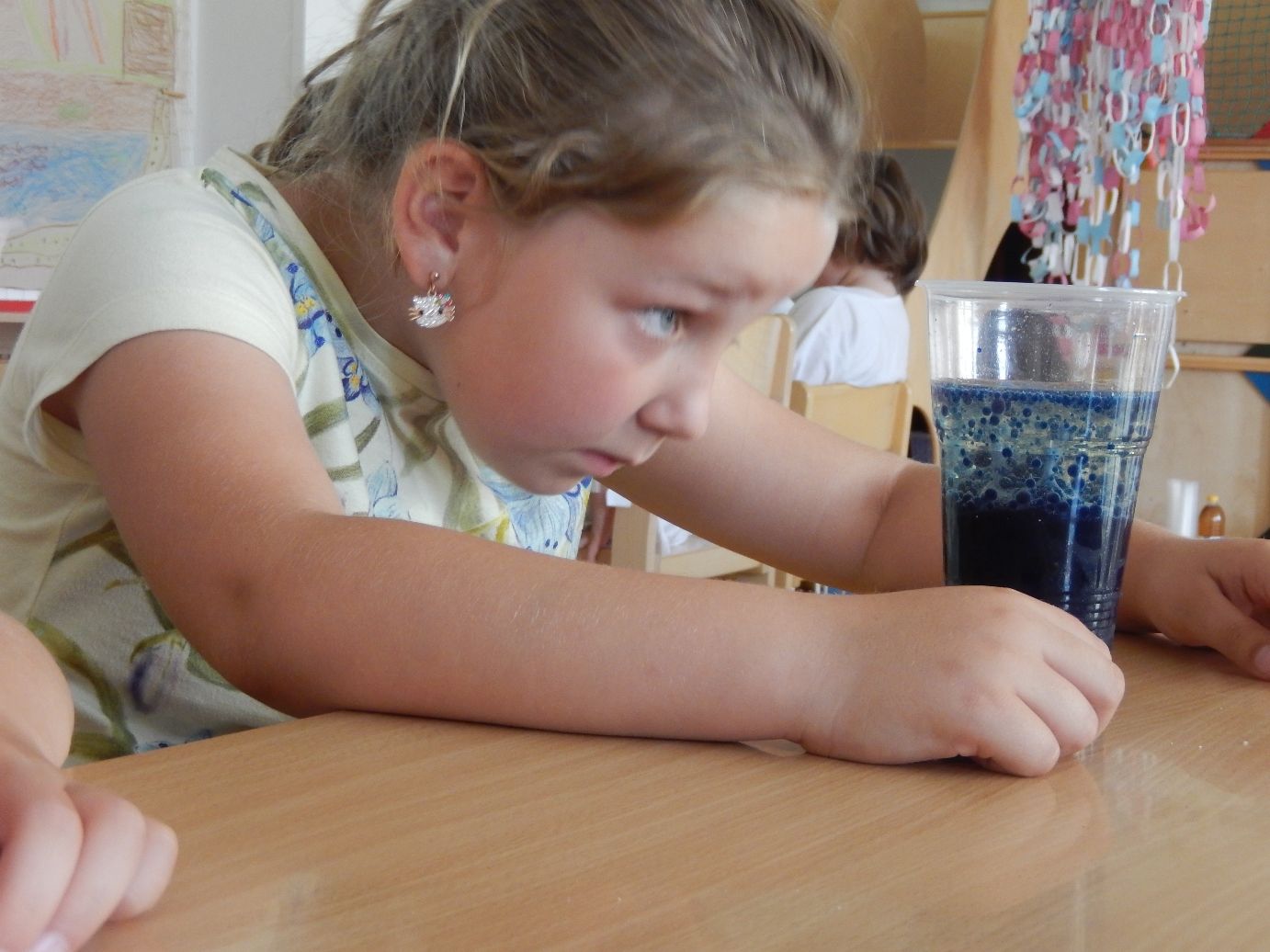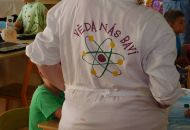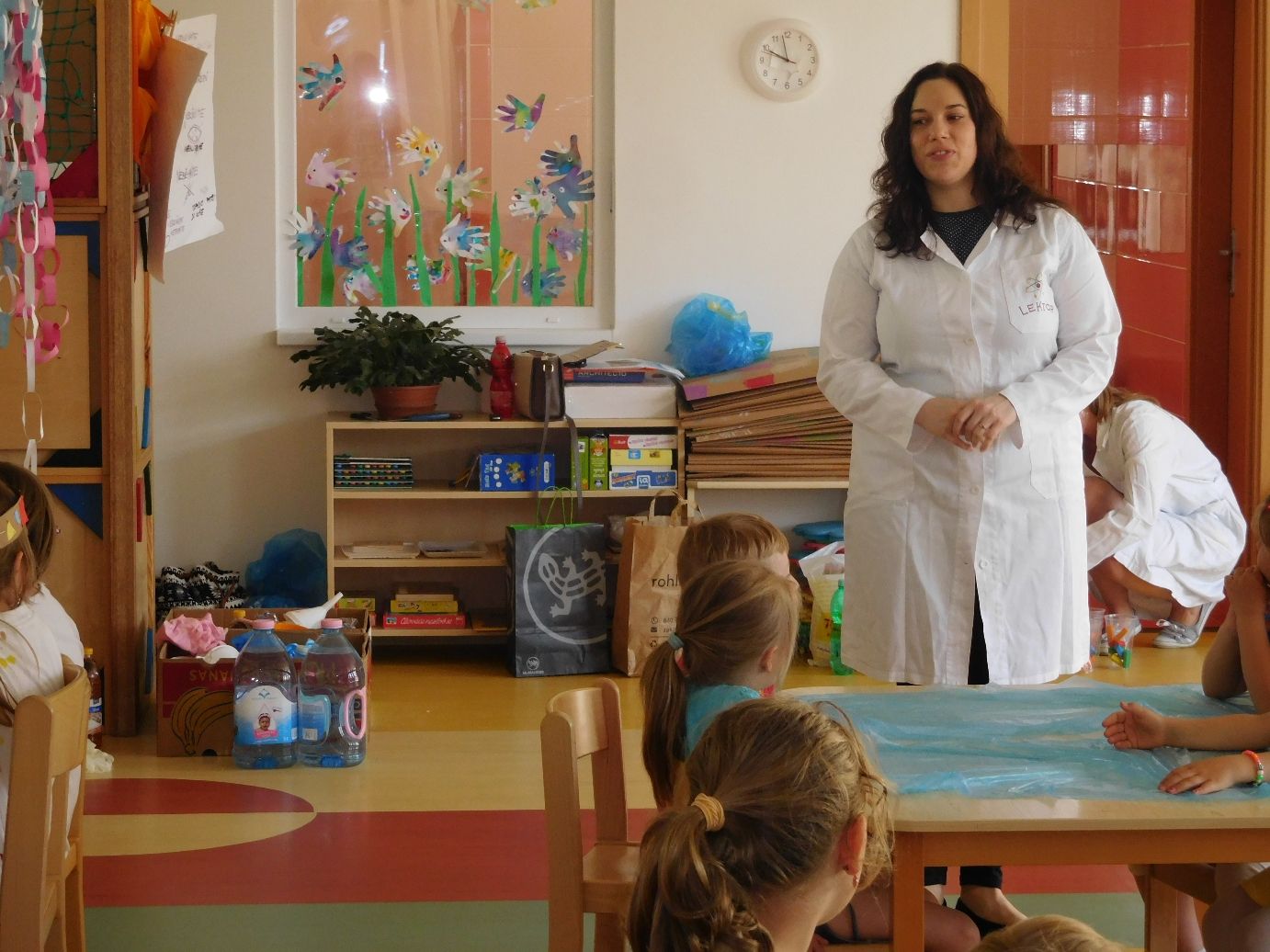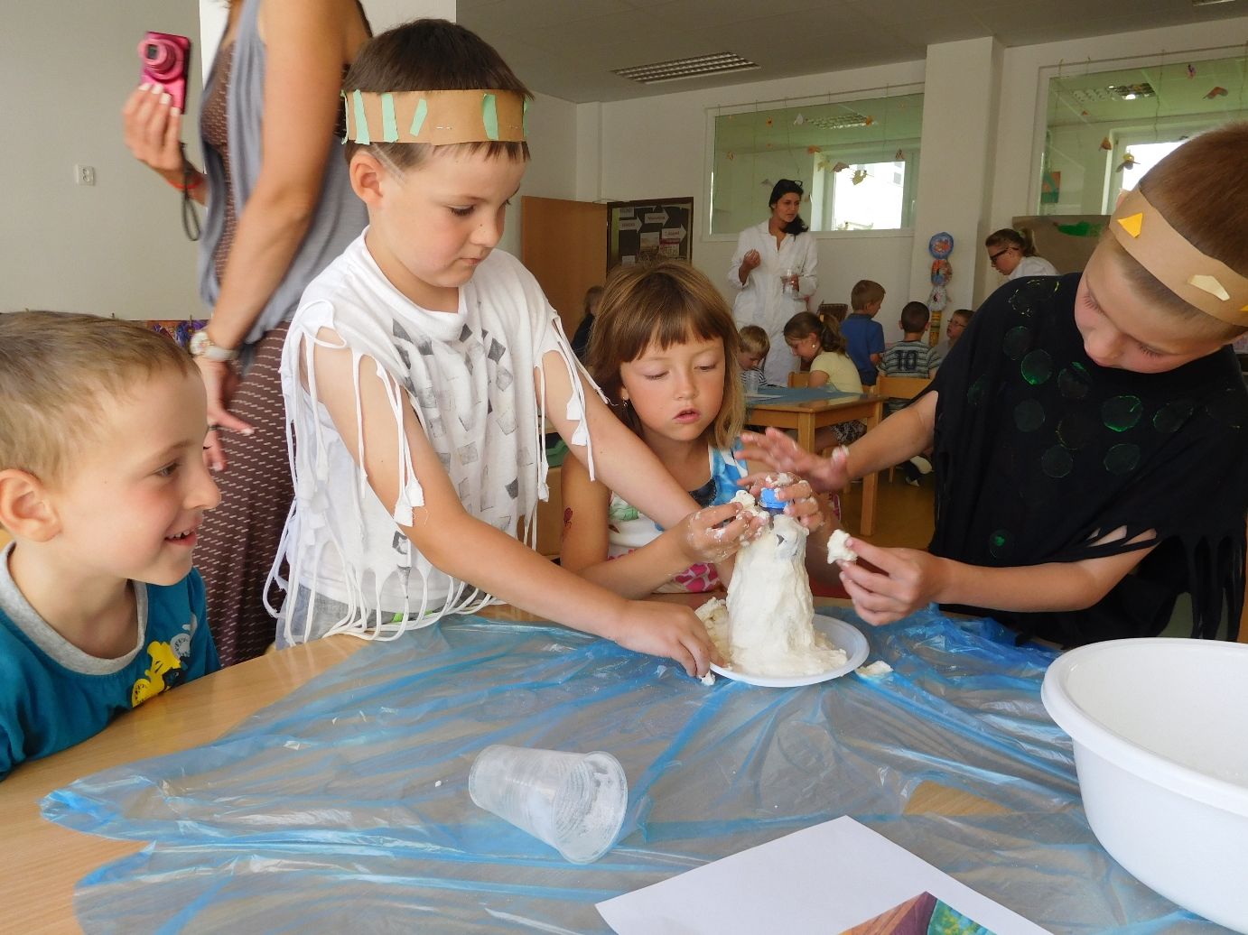 Pokusem číslo jedna byla obecně oblíbená sopka. Nejprve si lektorky s dětmi vysvětlily rozdíl mezi magmatem a lávou, popsaly si jednotlivé části sopky a s nadšeným očekáváním sopečné erupce se pustily do práce. Jednotlivé skupinky uhnětly z mouky, soli a vody těsto, kterým obalily plastovou láhev tak, aby objekt připomínal vulkán. Do láhve se pak nalila voda, která se obarvila potravinářským barvivem, a saponát na nádobí. Poté stačilo už jen přidat kypřící prášek, trochu octu a ze sopky se valila láva. Následovala výroba lávových lamp, jež byly pro některé děti neznámým pojmem. Složitou představu ovšem zrealizovaly jednoduchým postupem. V plastových kelímcích nalily k obarvené vodě olej. Obě tekutiny se vzhledem k rozdílné hustotě oddělily tak, že barevná voda zůstala dole a olej nahoře. Ke kýženému efektu lávové lampy se dospělo vhozením šumivé tablety do kelímku.