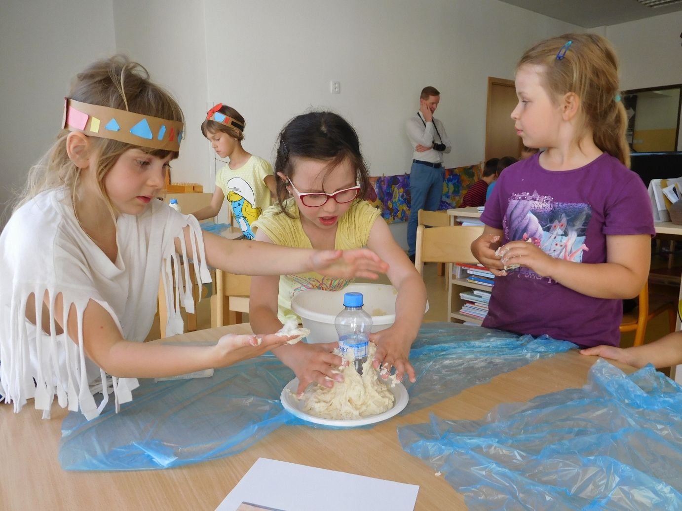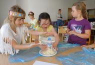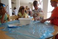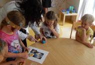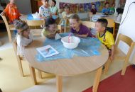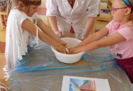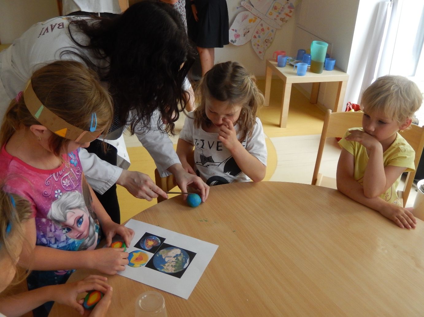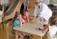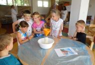 Po těchto náročnějších pokusech byl na řadě ten poslední, již trochu odlehčený úkol. Děti postupně vrstvily různé barvy plastelíny do tvaru kuličky. Když lektorky tyto kuličky rozřízly na poloviny, názorně si s dětmi ukázaly a vysvětlily strukturu naší planety.