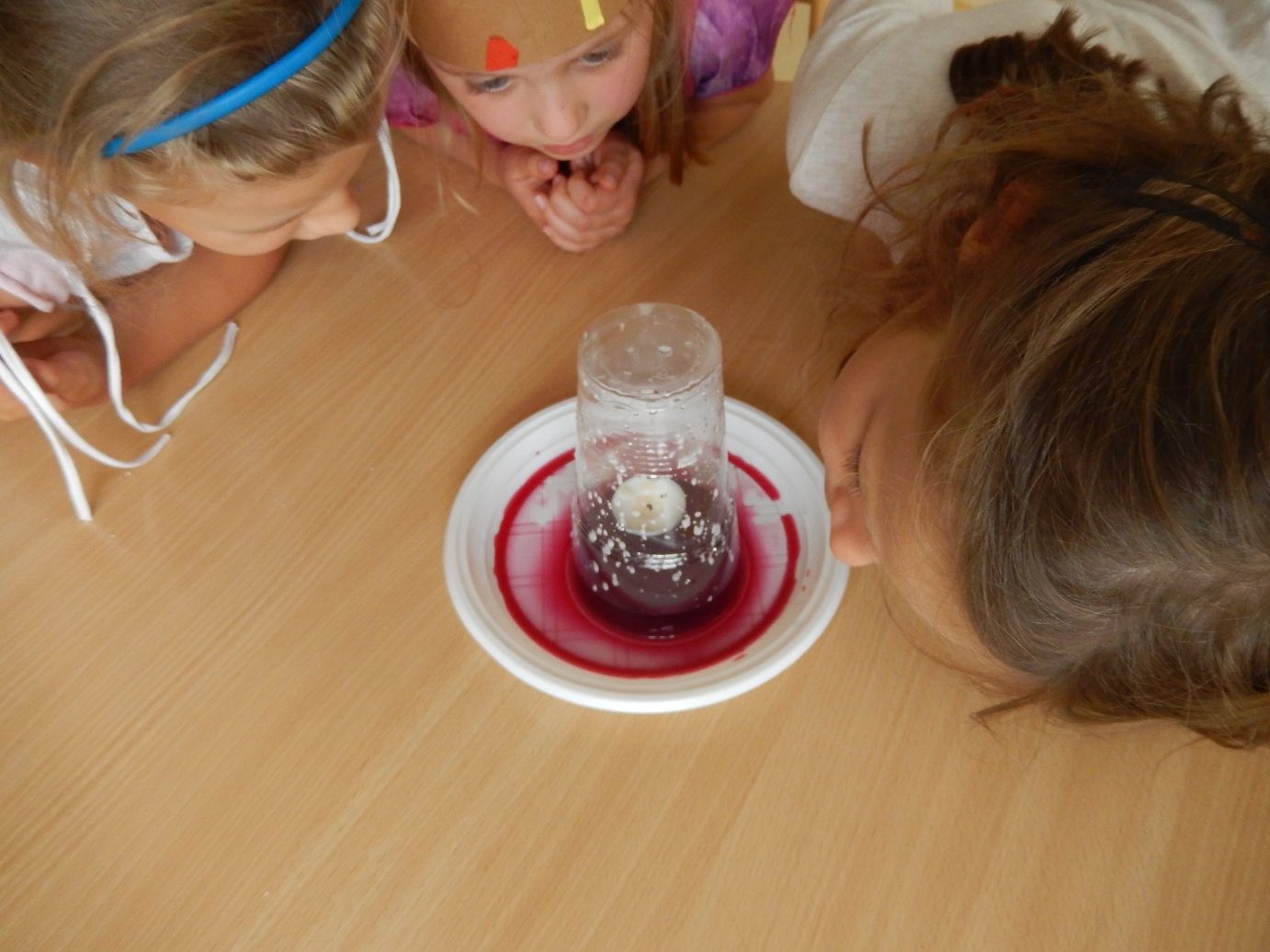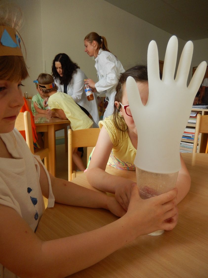 Poté se přešlo na experimentování se vzduchem s úvodem o hlavních složkách ovzduší, kyslíku, dusíku a oxidu uhličitém, a základech dýchání. Když se jedna z lektorek školáčků ptala, zda lze nafouknout rukavice bez použití úst, děti jen nevěřícně kroutily hlavou. Jak se přesvědčily, k nafouknutí rukavice postačí její natažení na kelímek s jedlou sodou a octem. Dalším experimentem odhalující fyzikální principy se stalo zkoumání procesů při absenci kyslíku. Do tácku s obarvenou vodou se umístila čajová svíčka a zapálila se. Následně byl na ni položen kelímek. Co se stalo? Oheň spotřeboval všechen kyslík v kelímku a jeho nepřítomnost vedla k naplňování kelímku kapalinou.