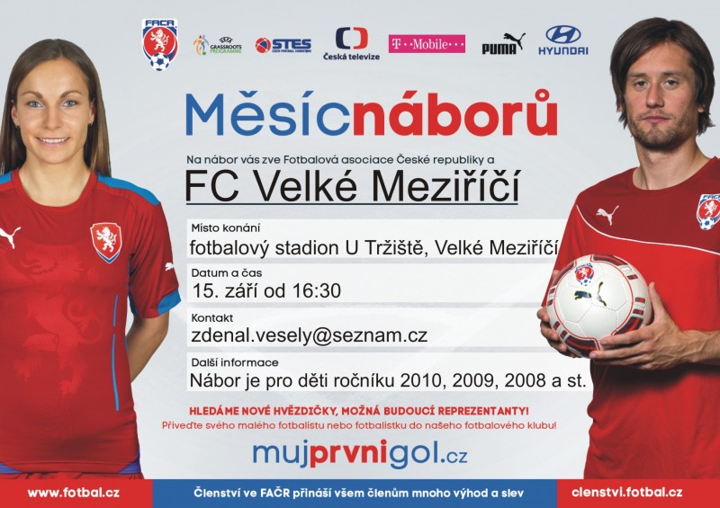 Fotbalový klub FC Velké Meziříčí ve spolupráci s Fotbalovou asociací České republiky pořádá ve čtvrtek 15. září 2016 od 16:30 na fotbalovém stadionu U Tržiště nábor hráčů a hráček do týmů přípravek.