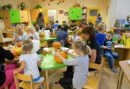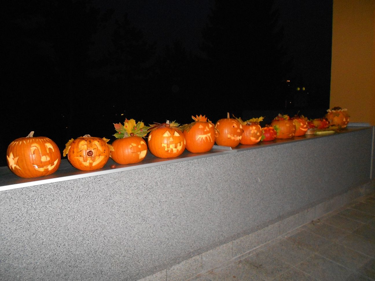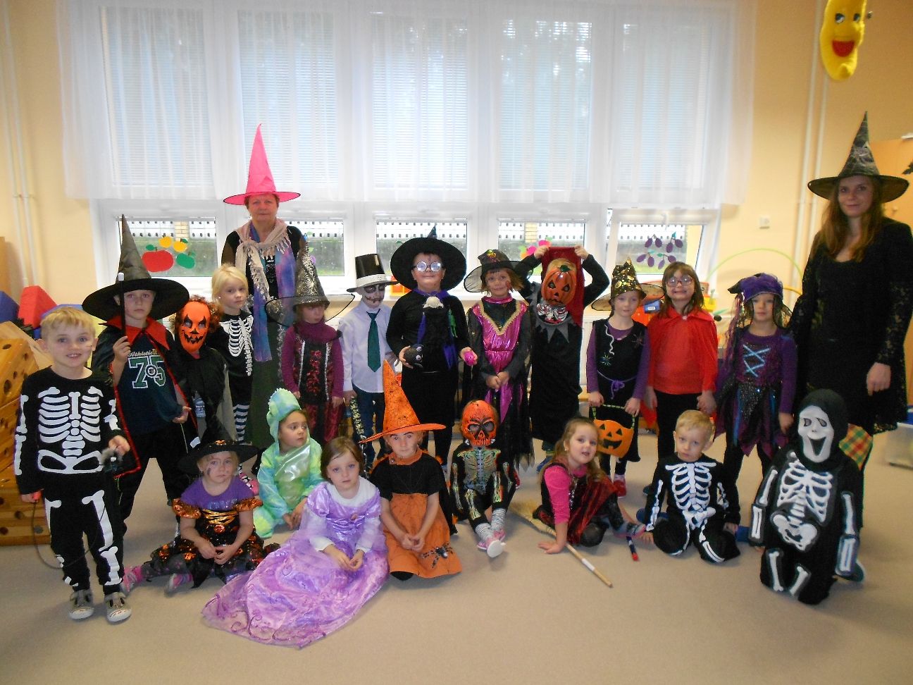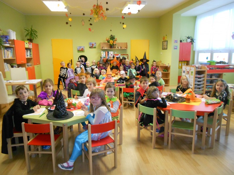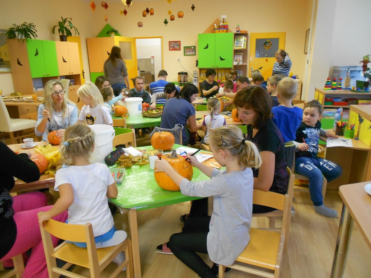 Nejprve jim předvedly krátký program s podzimními písničkami doplněný pohybem a básničkami. Potom společně vyřezávali dýně a vytvářeli z nich strašidla. V závěru podzimního odpoledne proběhlo rozsvícení strašidel na terase v MŠ. Hned následující den děti čekala halloweenská párty, které se zúčastnily ve strašidelných maskách čarodějnic, koster, duchů, upírů a dýní.