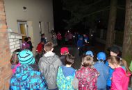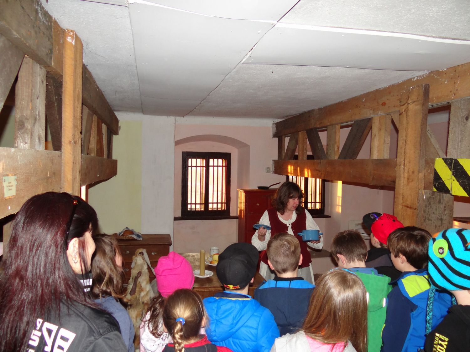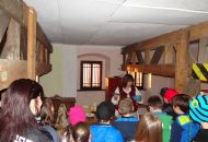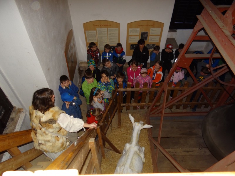 Ale vraťme se domů. My se ocitli ve středověku díky Myšpulínově stroji času dovedně skrytém v zeleném klobouku (podle Čtyřlístkového speciálu vydaného přímo k této příležitosti). Vyrazili jsme na kostelní věž. Potkali se tam s manželkou věžníka a ochutnali křížaly, povidla i maz při povídání o životě na tak zvláštním místě. Podívali jsme se na večerní město z ochozu, poslechli si přímo ve zvonici zvony a vyzkoušeli na vlastní kůži vynášet z chlívku pod bytem kozu na pastvu. Poté nás v katovně přivítal sám mistr ostrého meče a přihlíželi jsme (nakonec nezdařené) popravě. Nad ohněm se opékaly špekáčky, hrál se kořeněný kvíz (čímpak se toho času asi dochucovalo?). Došlo i na šprýmovnou scénku z hospody v podání dorostu šermířské skupiny, která nás ve svém sídle takto přivítala.