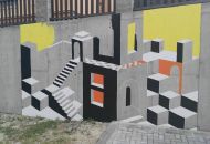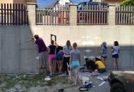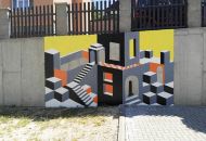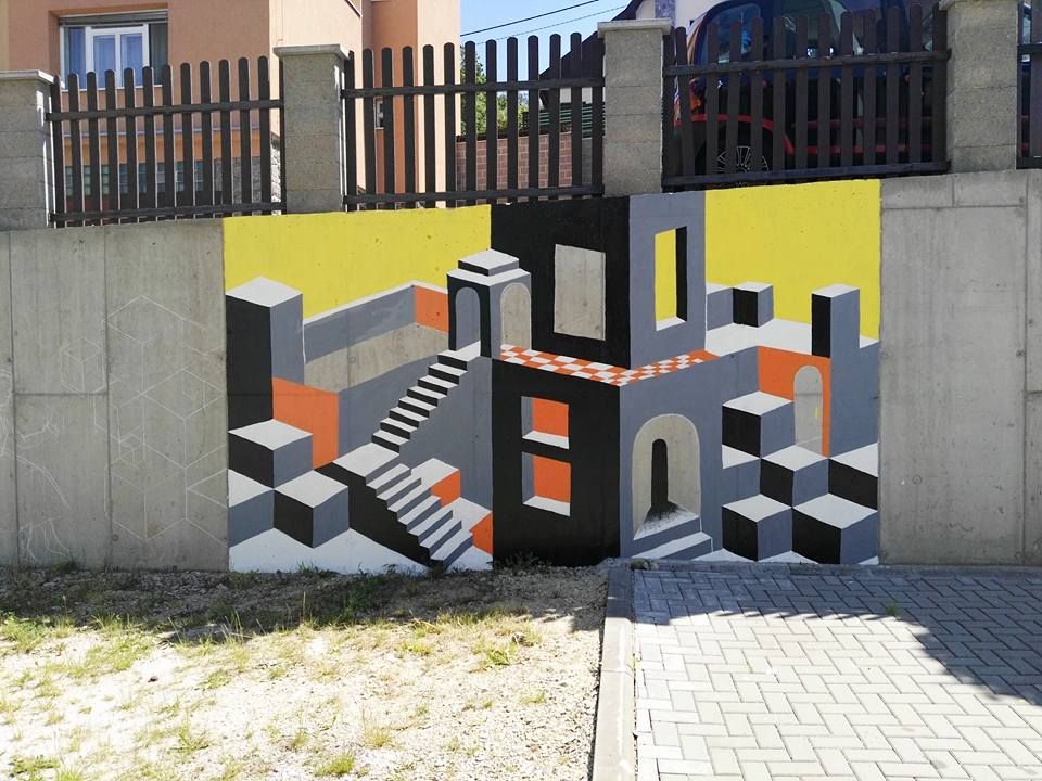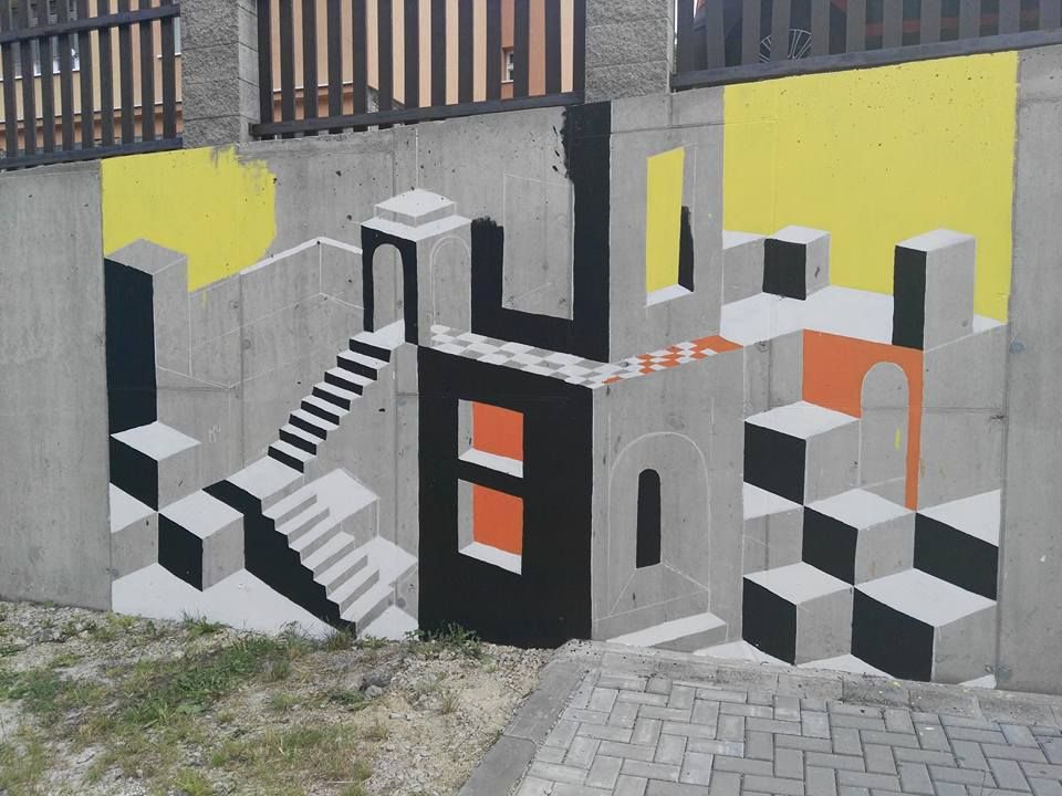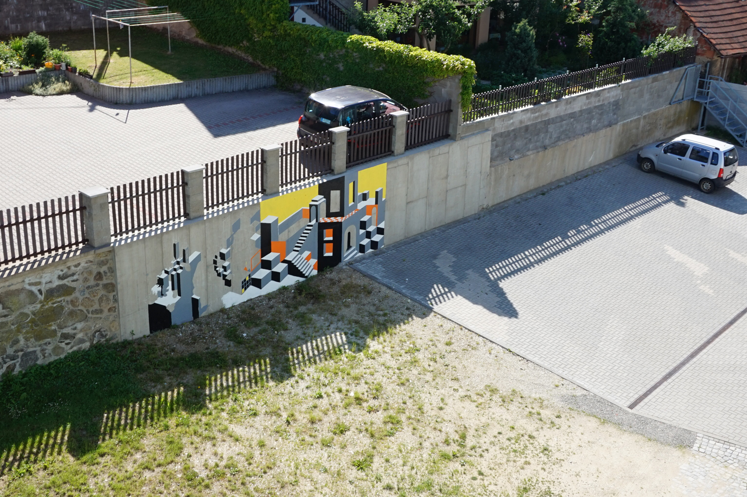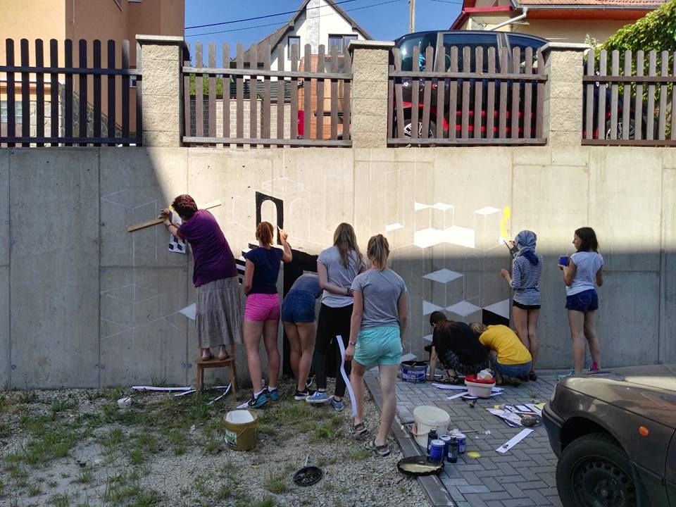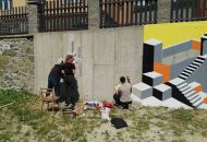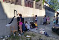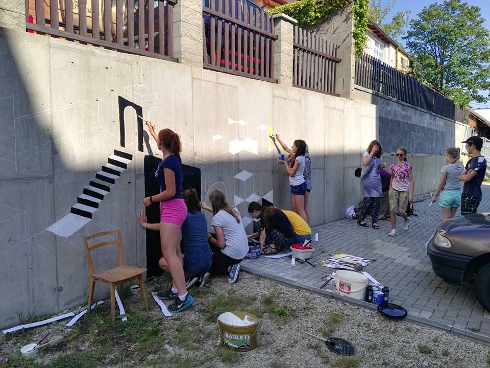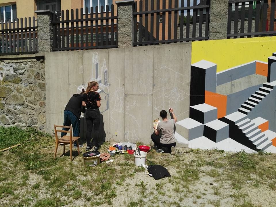 Opěrná zeď za základní uměleckou školou dostává novou výzdobu. V rámci výuky výtvarného oboru zde děti tvoří 3D malby podle návrhů svých tří učitelek.