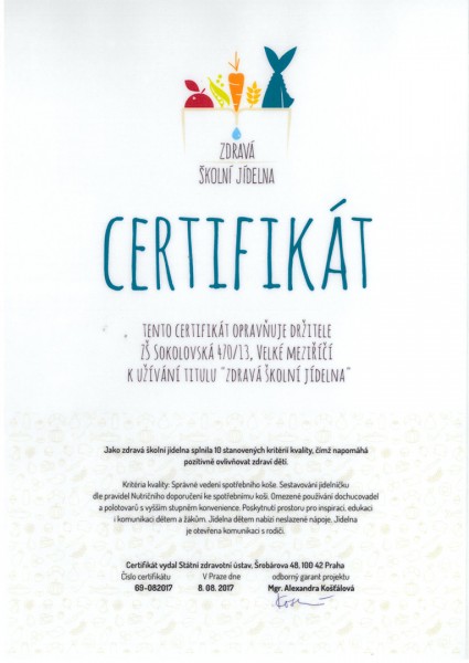 Po půlročním snažení se nám podařilo získat certifikát a od 8. srpna 2017 můžeme jako první školní jídelna ve Velkém Meziříčí a jako čtvrtá v Kraji Vysočina užívat titul „ZDRAVÁ ŠKOLNÍ JÍDELNA“.