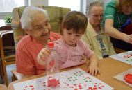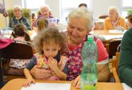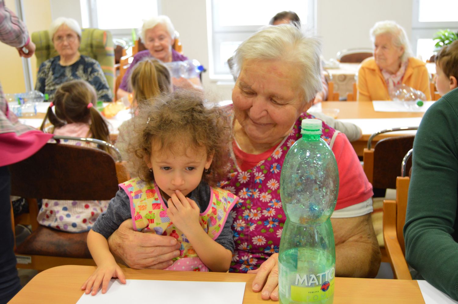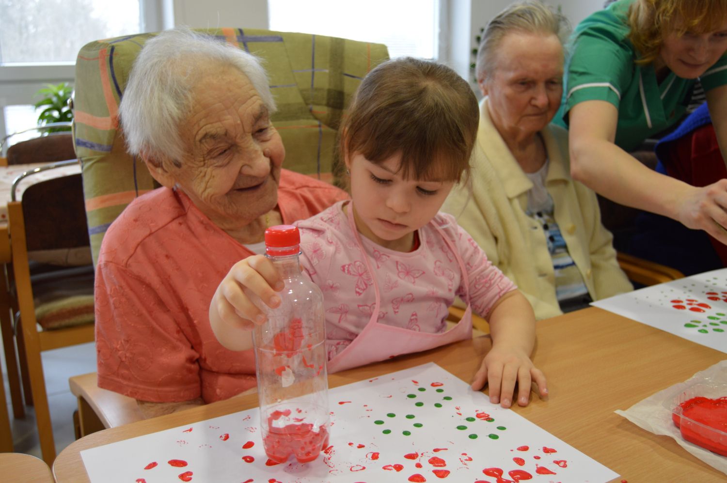Tentokrát se v rámci mezigenerační spolupráce, po úvodní rozcvičce vedené dětmi, všichni pustili do výroby pestrobarevných květů v jídelně domova, které následně ozdobí celou budovu. Děti společně se seniory otiskovaly jednoduchou technikou PET láhve na papír. Výtvarná tvorba všechny moc bavila, což dokazovaly nejen rozzářené oči, ale i roztomilé zapatlání barvami všech zúčastněných.