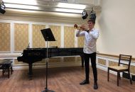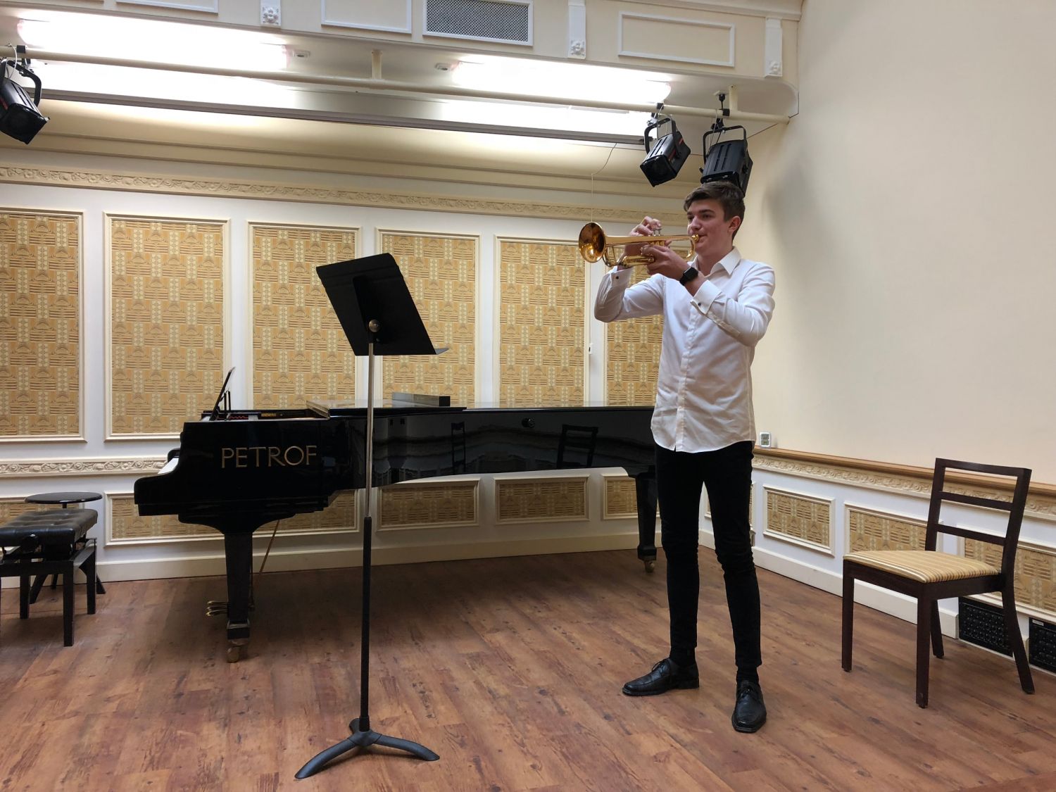 Vít Nedoma ve hře na lesní roh 1. místo s postupem do ústředního kola (II. kategorie)