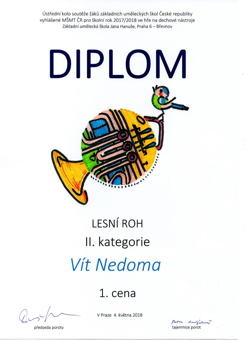 Ve dnech 3.–6. května 2018 se v Praze konalo ústřední kolo soutěže ve hře na dechové nástroje, vyhlašované MŠMT. ZUŠ Velké Meziříčí reprezentoval mladý hráč na lesní roh Vít Nedoma ze třídy p. uč. Radovana Hajného, který se přes školní, okresní a krajské kolo probojoval do ústředního kola, kde ve velké konkurenci získal vynikající 1. místo.