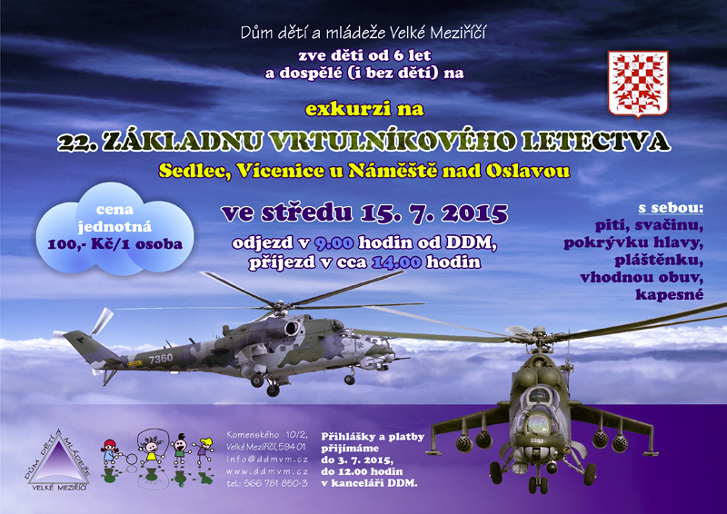 Dům dětí a mládeže Velké Meziříčí zve děti od 6 let a dospělé (i bez dětí) na exkurzi na 22. Základnu vrtulníkového letectva v Sedleci, Vícenice u Náměště nad Oslavou. Odjezd ve středu 15. 7. 2015 v 9.00 od DDM, příjezd zhruba ve 14.00. S sebou pití, svačinu, pokrávku hlavy, pláštěnku, vhodnou obuv a kapesné. Jednotná cena 100 Kč/osoba.