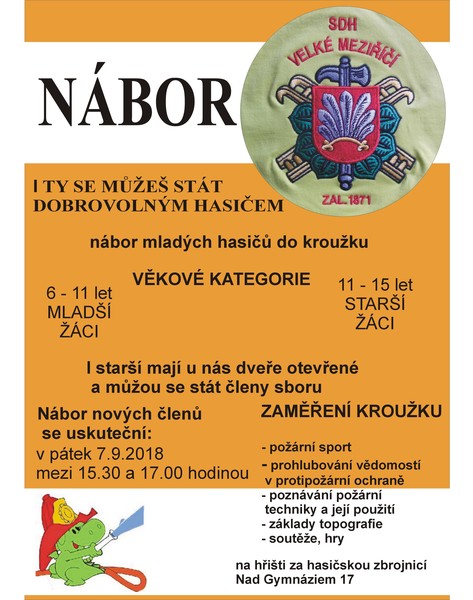 Velkomeziříčští dobrovolní hasiči pořádají nábor dětí ve věku 6 až 15 let do hasičského kroužku. Zájemci mohou přijít v pátek 7. září 2018 v době od 15.30 do 17.00 na hřiště za hasičskou zbrojnicí ve Velkém Meziříčí.