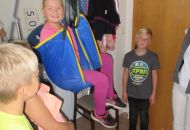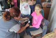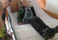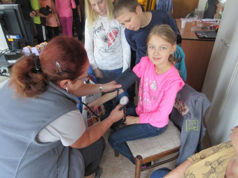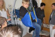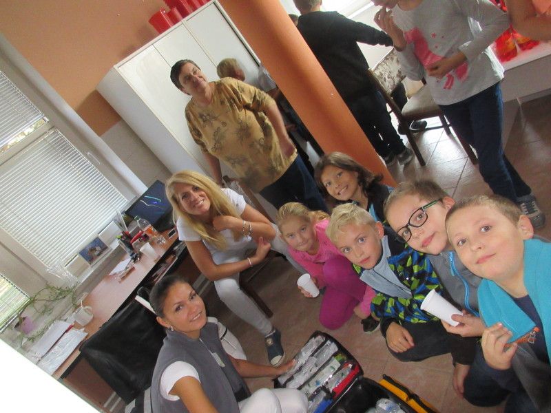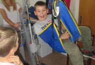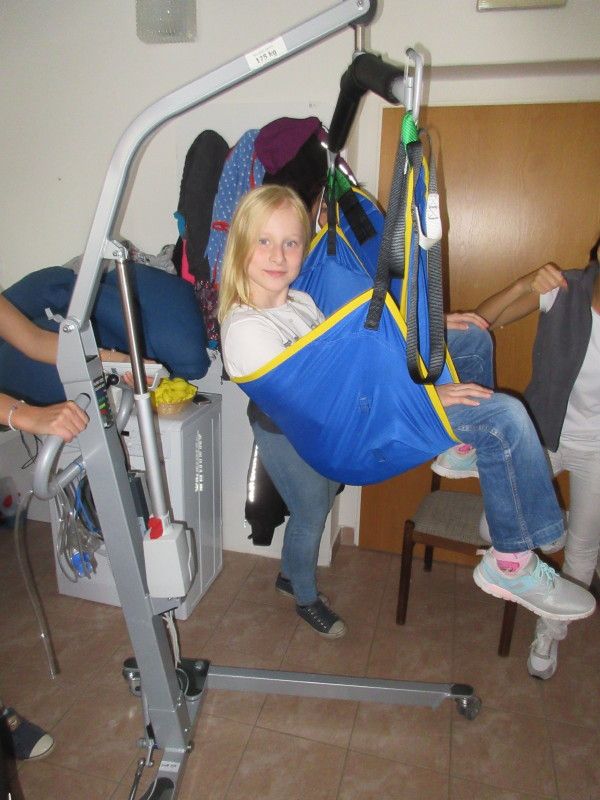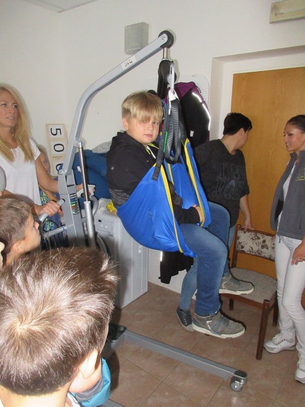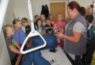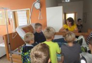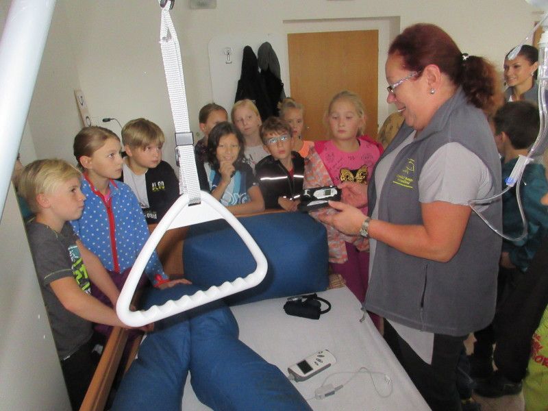 Děti si se zájmem prohlédly zdravotnické vybavení a kompenzační pomůcky, které zde půjčují do domácností. Všechny dostupné pomůcky dámy dětem předvedly a vysvětlily jim, jak se s nimi zachází. K velké radosti si děti mohly některé pomůcky vyzkoušet přímo na místě. Například zvedák určený ke zvedání a přepravování osob s pohybovými obtížemi, polohovací lůžko, různé druhy digitálních přístrojů na měření vitální kapacity plic, tlaku a tepové frekvence, glukometr apod. Pozornost dětí rovněž upoutaly batohy plné zdravotnického materiálu, se kterými zdravotnice „vyráží“ do terénu.