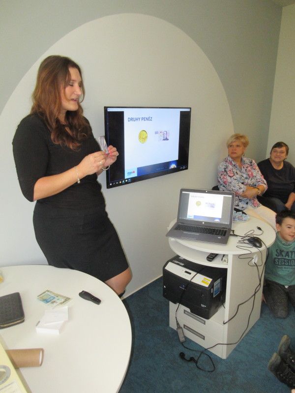 Také jsme se dověděli zajímavé informace o bankovkách a mincích, o jejich hodnotách a o falešných penězích. Měli jsme příležitost prohlédnout si různé prostory místní pobočky, dokonce jsme se elektronicky spojili s videobankéřkou v Ostravě, která si s dětmi povídala o našem projektu. Děti si vyzkoušely přístroj na počítání mincí i bankovek a prohlédly si bankovky různých zemí. Zkusily si vybrat peníze z bankomatu a zase je vložit zpět, rovněž si s obrovským zájmem potěžkaly 1.000.000 Kč.