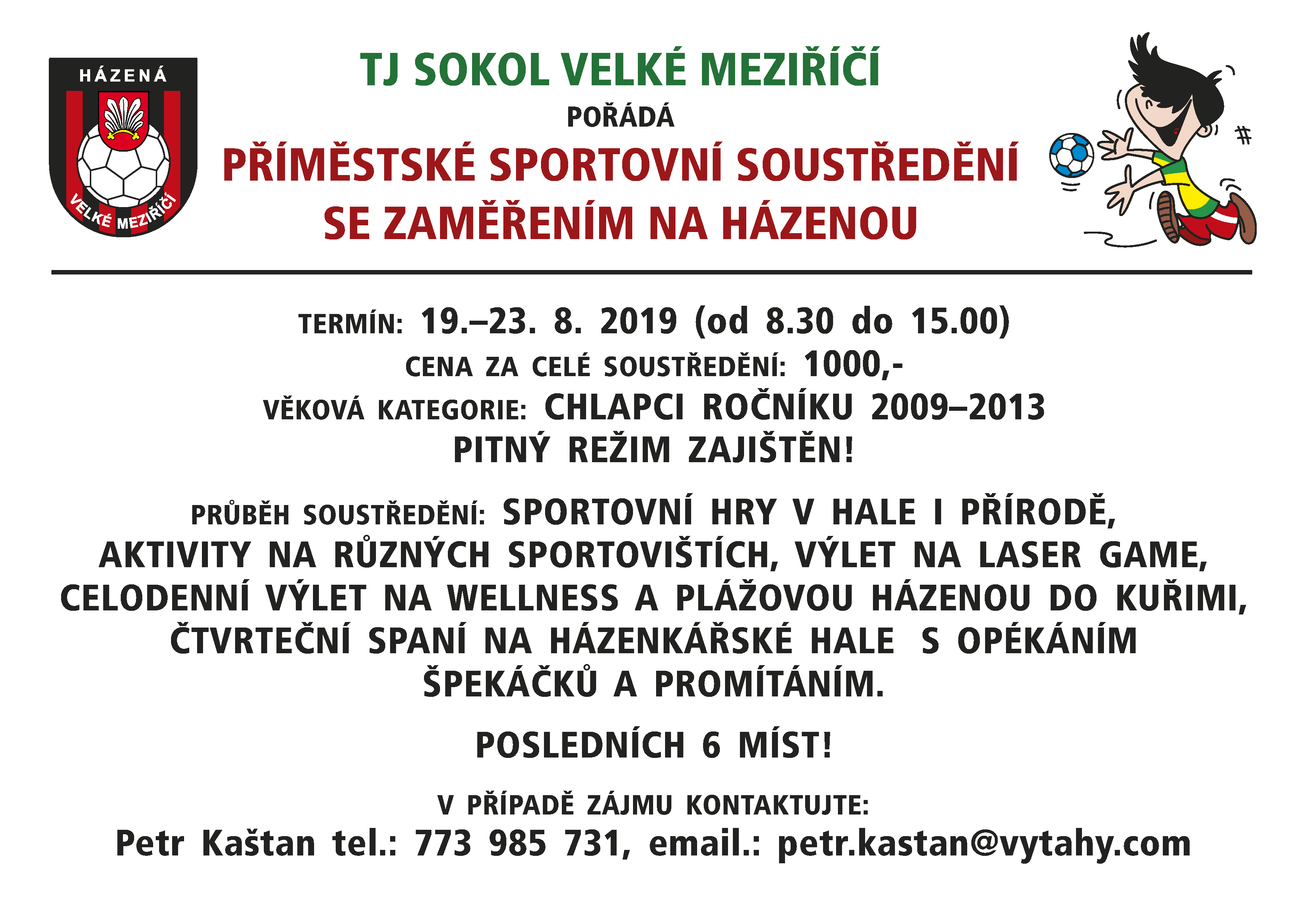TJ Sokol Velké Meziříčí pořádá pro chlapce ve věku od 6 do 10 let (roč. narození 2009-2013) příměstské sportovní soustředění se zaměřením na házenou.