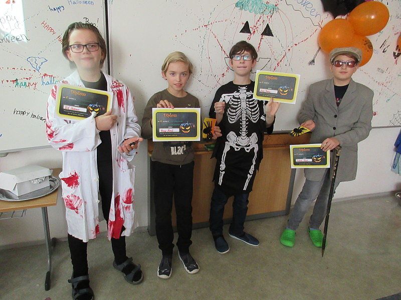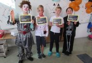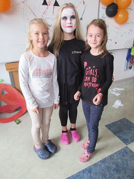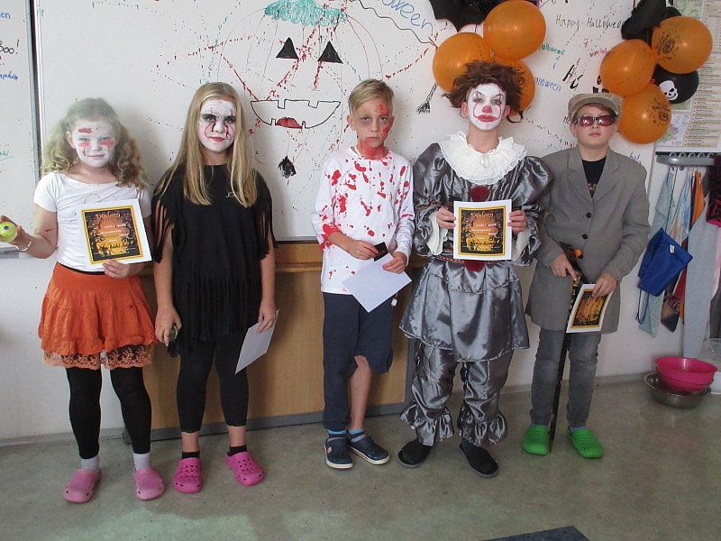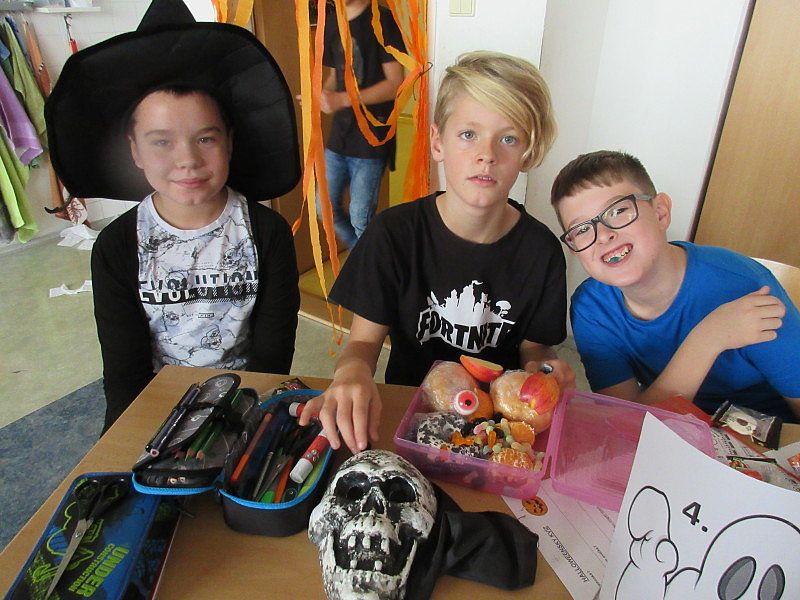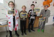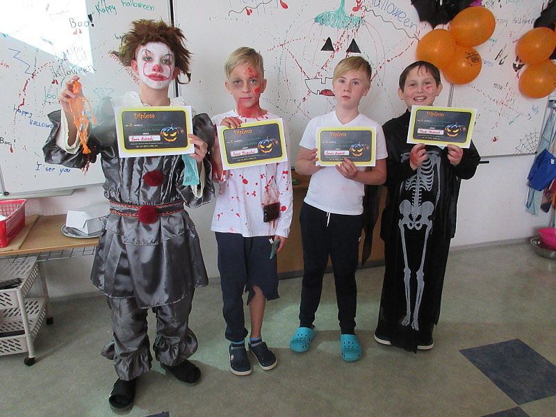 Mnozí žáci pro dokreslení halloweenské atmosféry přišli do školy v kostýmech nebo si pomalovali obličeje strašidelnými motivy. Celý den se nám vydařil a hezky jsme si ho užili.