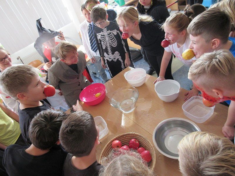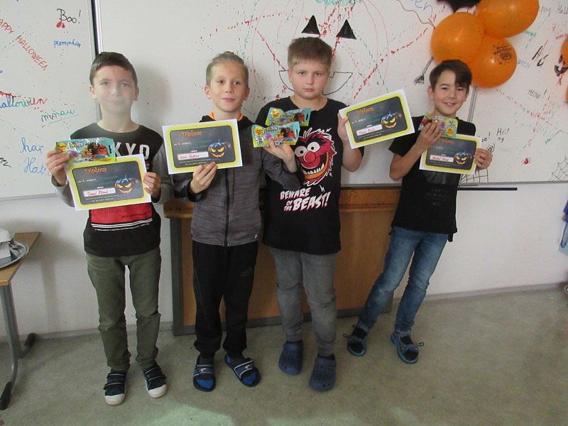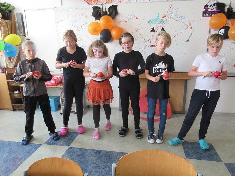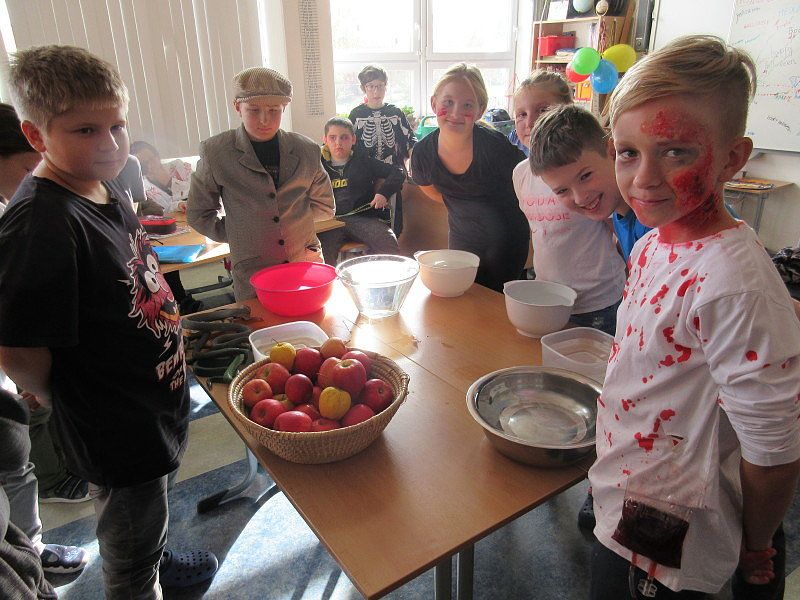 Děti z naší třídy v hodinách výtvarné a pracovní výchovy vyráběly dekorace na výzdobu třídy a v literární výchově diskutovaly o zvycích a symbolech tohoto svátku. Zároveň také řešily, v jaké masce půjdou ve smluvený den do školy. Zakončení projektu vyvrcholilo soutěžním dopolednem, kde se 6 družstev utkalo v různých soutěžních disciplínách typických pro Halloween. Kromě vyhlášení nejzajímavější masky při halloweenském závodu družstva hledala po celé třídě malé kartonové dýně. Děti také řešily halloweenový kvíz, odpovídaly na "Halloweenské otázky" aniž by se rozesmály, hádaly pohádkové postavy, proměňovaly pomocí pastelek tiskací písmena v postavy či předměty, poznávaly poslepu různé předměty, hledaly ukryté penízky ve sklenici s různými živými (moučnými červy a cvrčky) i umělými zástupci z živočišné říše, předávaly si jablka v řadě za sebou pomocí brady, loupaly jablka a snažily se ukrojit co nejdelší slupku, lovily jablka v misce s vodou pomocí úst, balily mumii do toaletního papíru a střílely florbalovou hokejkou míček do otvorů dýně z kartonu.