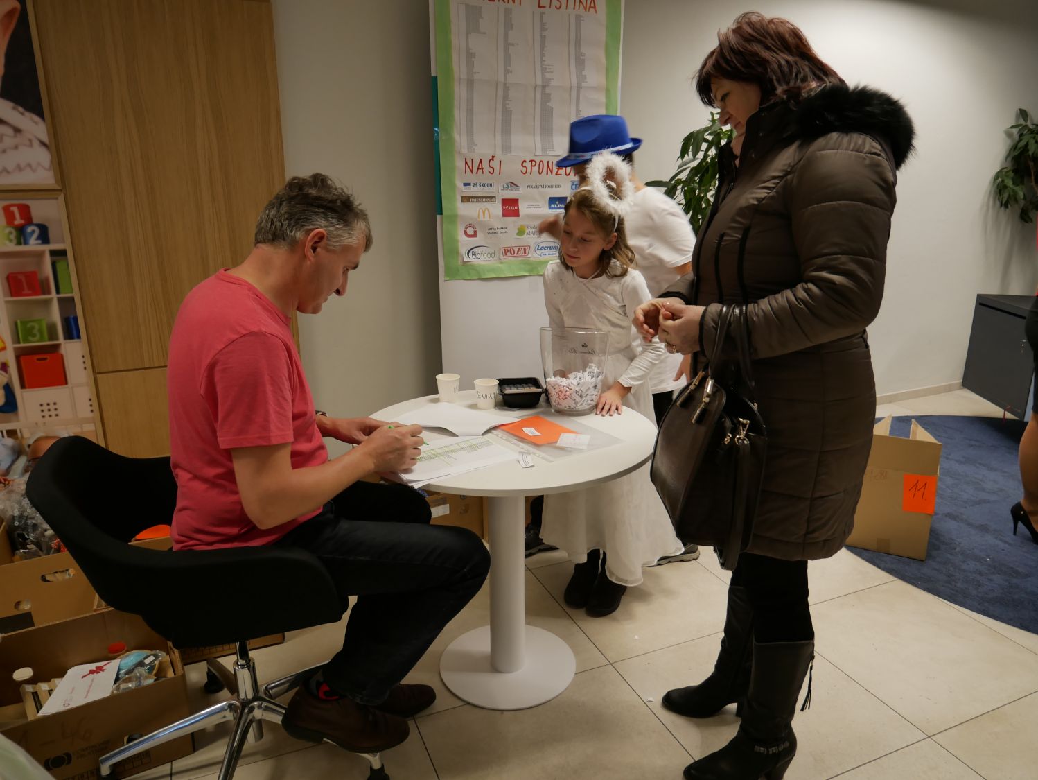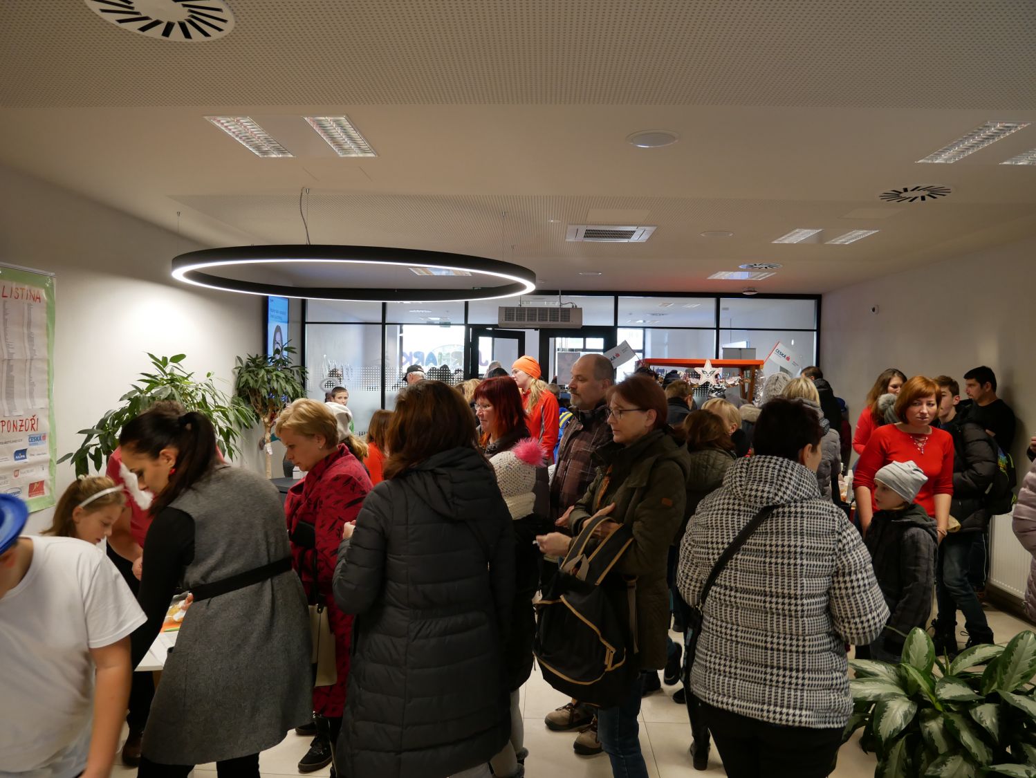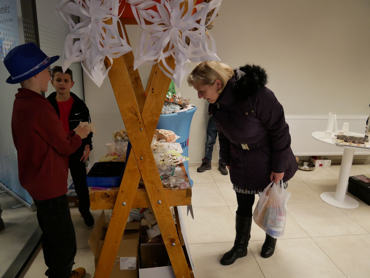 Součástí dnešního jarmarku bylo taneční vystoupení, bohatá tombola i aukce. V dražbě se podařilo žákům prodat dort s logem naší firmy Andělská kavárna a krásný obraz malovaný chlapcem ze třídy.
