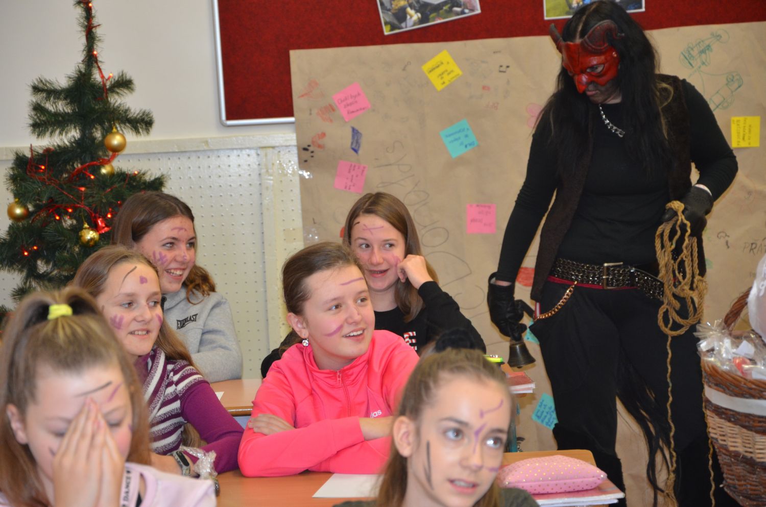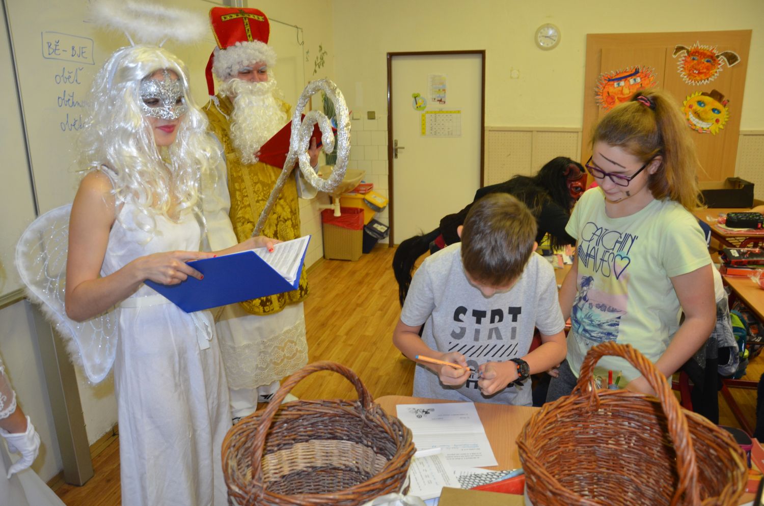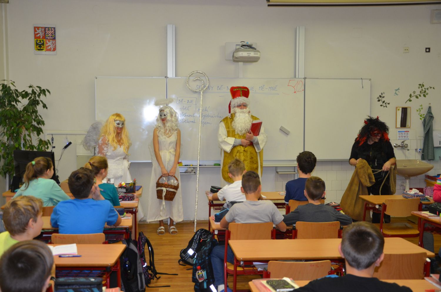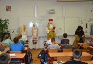 Významné role se tradičně ujali žáci devátých ročníků, kteří zavítali k dětem na první stupeň, a letos poprvé také pedagogičtí pracovníci školy, kteří navštívili třídy stupně druhého. Mikuláši nechyběla pečlivě připravená vševědoucí kniha hříchů, takže byli všichni provinilci odhaleni a usvědčeni. Museli slíbit své polepšení a odpykat si uložený trest. Čerti je pak náležitě odměnili pekelným uhlím. Nakonec se slova ujali laskaví andělé a všechny děti obdarovali pestrobarevným kornoutem se sladkými dobrotami.