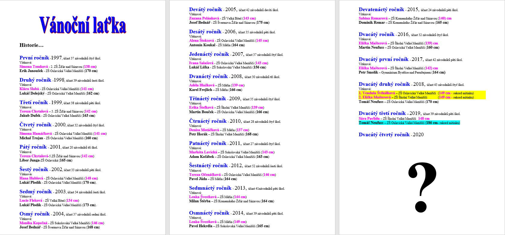 Letošní již XXIII. ročník školní sportovní akce přinesl řadu výborných osobních výkonů a posunutí rekordní hranice v kategorii chlapců. Na okresním kole atletické disciplíny skoku vysokém se sešla konkurence osmnácti dívek a dvaceti jednoho chlapce z pěti základních škol okresu.