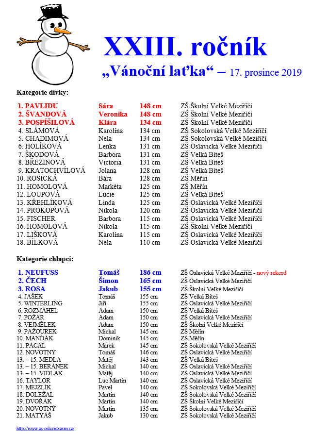 Ale více k závodu. Do výšky 155 cm se držela suveréna soutěže čtveřice pronásledovatelů, z nichž se nakonec nejvíce dařilo stříbrnému Šimonu Čechovi 165 cm z pořádající školy. O pořadí na třetím až pátém místě rozhodl při shodném výkonu až menší počet nezdařených pokusů. Bronzovou medaili nakonec bral Jakub Rosa ze Základní školy Sokolovská Velké Meziříčí před čtvrtým Tomášem Jaškem ze Základní školy Velká Bíteš, konečnou pátou příčku obsadil domácí Jiří Winterling.