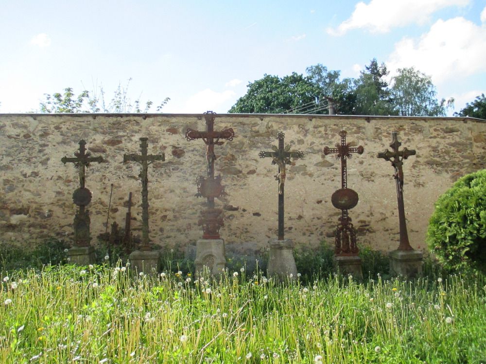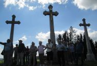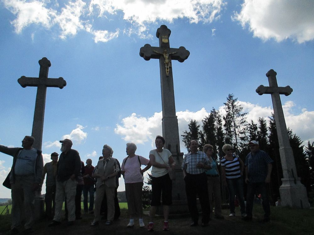 Další zastávkou byla vyhlídka Tři kříže nad Novým Městem na Moravě. Tři kříže, Kaplisko, nebo též Kalvárie, představují projev vděku za to, že ani jeden obyvatel Nového Města nepodlehl epidemii moru. V roce 1928 byla ke Třem křížům vysázena javorová alej – Alej smíření, vedoucí od evangelického hřbitova ke Třem křížům. Za každého mrtvého obyvatele z 1. světové války byl vysazen jeden strom. Na evangelickém hřbitově je pochován např. sochař Vincenc Makovský nebo spisovatel Josef Věromír Pleva.