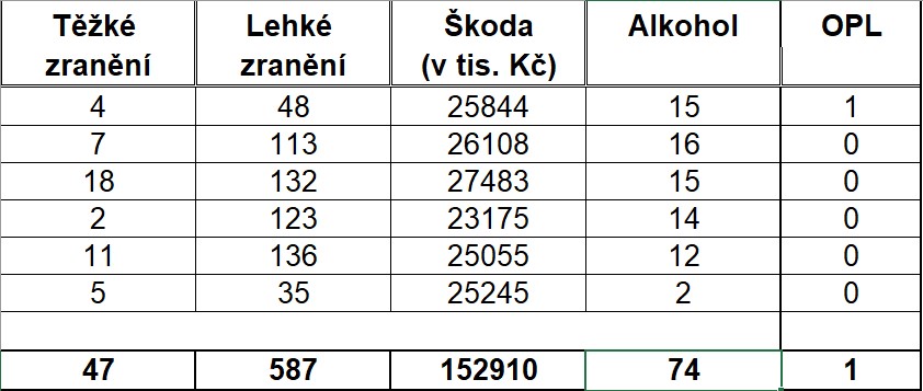 Letošní dopravní nehody si vyžádaly již devatenáct obětí, když sedmnáct účastníků zemřelo bezprostředně při dopravní nehodě a dvě osoby zemřely na následky zranění ve zdravotnickém zařízení. Za negativní jev dopravní policisté považují skutečnost, že se v našem kraji v letošním roce výrazně zvýšil počet dopravních nehod s tragickými následky. Jen v měsíci červnu zemřelo v našem kraji při dopravních nehodách pět osob, když tři cizinci zahynuli při jedné dopravní nehodě, která se stala na dálnici D1.