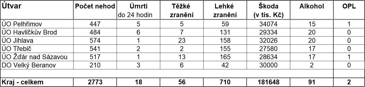 Letošní dopravní nehody si vyžádaly již jednadvacet obětí, když osmnáct účastníků zemřelo bezprostředně při dopravní nehodě a tři osoby zemřely na následky zranění ve zdravotnickém zařízení. Za negativní jev dopravní policisté považují skutečnost, že se v našem kraji v letošním roce výrazně zvýšil počet dopravních nehod s tragickými následky. Loni zemřelo za sedm měsíců při dopravních nehodách v našem kraji celkem 16 osob - bezprostředně při nehodě 14 osob a dvě osoby podlehly zraněním ve zdravotnickém zařízení.