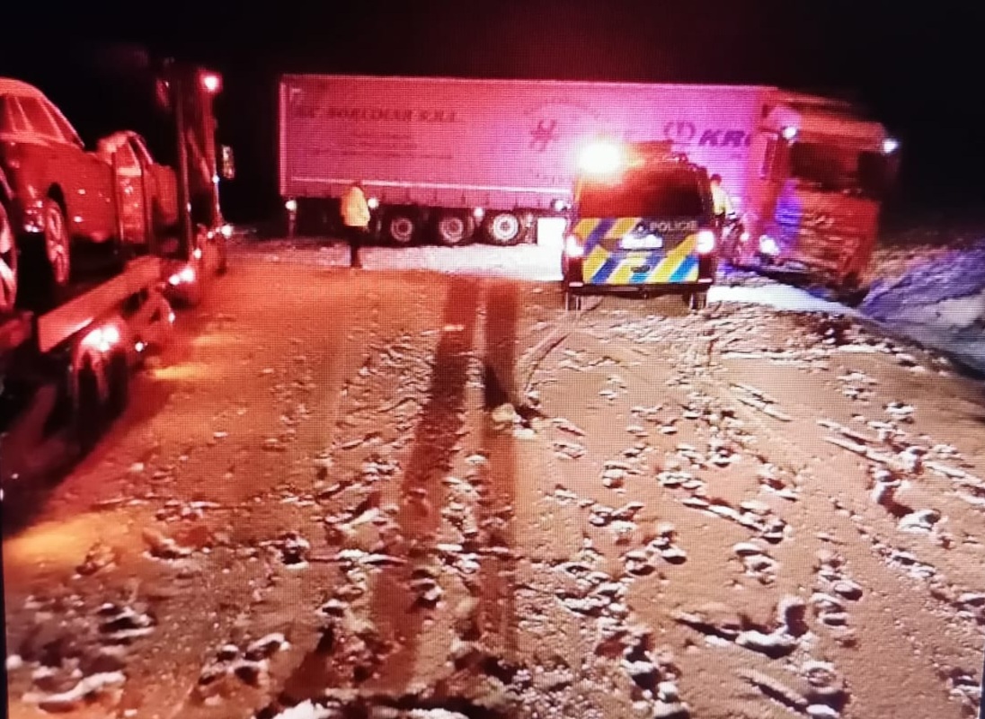 Od časného rána jsou na území celého kraje problémy se sjízdností komunikací všech typů, včetně dálnice D1. Tu zablokoval kamion, který havaroval před půl pátou ráno na 156,5 kilometru dálnice D1 ve směru na Prahu a zůstal stát nepojízdný přes všechny jízdní pruhy.