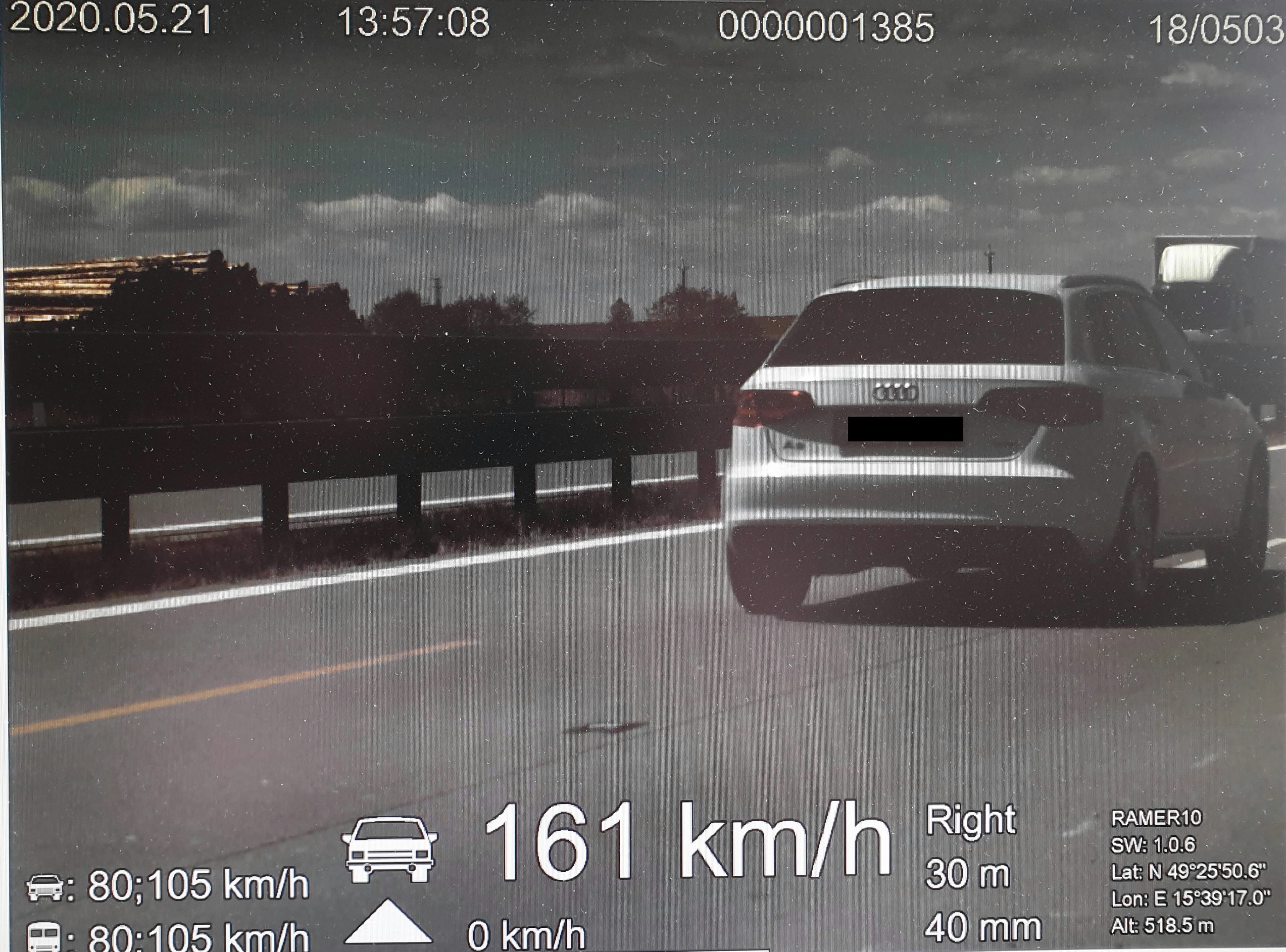 Policejní hlídka dálničního oddělení včera – ve čtvrtek 21. května v odpoledních hodinách - kontrolovala na dálnici v modernizovaném úseku v omezení na 117. kilometru ve směru jízdy na Prahu dodržování nejvyšší povolené rychlosti. Místem projelo krátce před čtrnáctou hodinou osobní vozidlo Audi s českou registrační značkou a jeho čtyřiačtyřicetiletý řidič jel rychlostí 161 kilometrů v hodině, tedy nejvyšší povolenou „osmdesátku" překročil dvojnásobně. Takový přestupek nelze projednat na místě, proto policisté přestupek zadokumentovali a předali do správního řízení příslušnému správnímu orgánu. A podobně vysokých překročení nejvyšší povolené rychlosti v úsecích, kde probíhá modernizace, zjišťujeme denně několik.