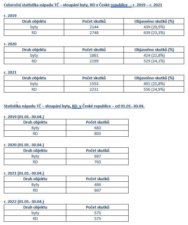 - Podle dlouhodobých statistických výstupů se pachatelé dostávají do obydlí nejčastěji překonáním vstupních dveří, přes balkon nebo okny, která nechávají lidé v době své nepřítomnosti často nezabezpečená.
