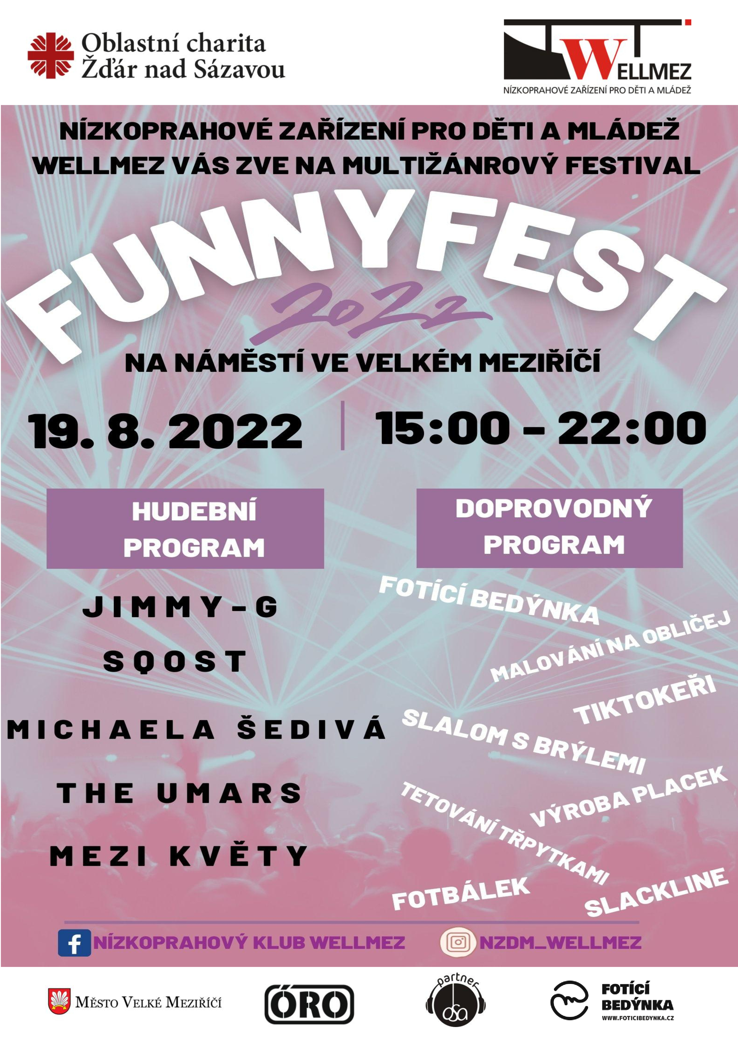 Nízkoprahové zařízení pro děti a mládež Wellmez spadající pod Oblastní charitu Žďár nad Sázavou působí ve Velkém Meziříčí již od roku 2011. Každoročně připravují pracovníci nízkoprahového zařízení pro své uživatele a širokou veřejnost multižánrový festival FUNNY FEST. Akce proběhne v pátek 19. srpna na náměstí ve Velkém Meziříčí od 15:00 do 22:00.