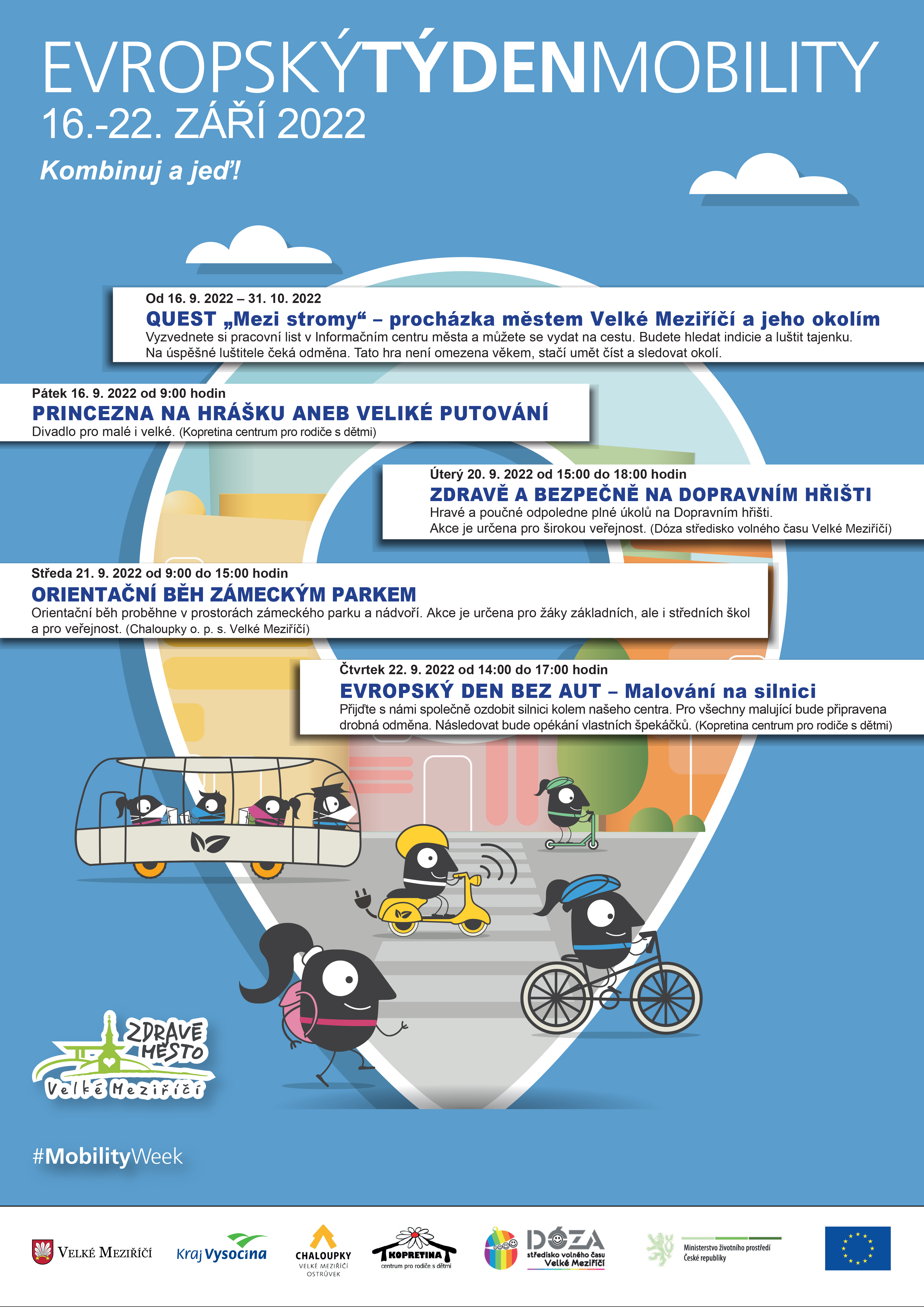 Od 16. do 22. září máte možnost se zapojit do akce s názvem Evropský týden mobility. Ta se zaměřuje hlavně na omezení znečištění ve městě a jeho okolí a celkově ekologii. V rámci každoročního programu si Zdravé město Velké Meziříčí spolu s místními organizacemi připravilo velmi lákavý program. Těšit se můžete na tradiční aktivity jako například quest, orientační běh, malování na silnici a spoustu dalšího.